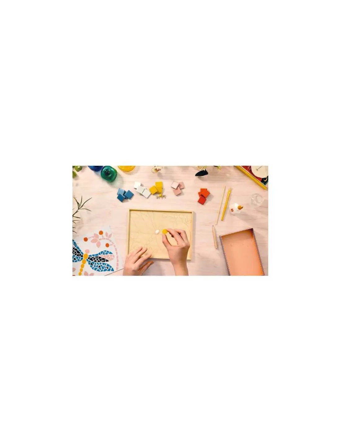 Ce coffret comprend 1 plaque de bois imprimée, 100 tesselles en céramique, 1 pince de mosaïste à couper les tesselles, 1 sachet de ciment, 1 spatule souple, 1 tube de colle, 1 modèle à suivre, un dépliant et une carte avec QR code menant à une vidéo tuto pour découvrir l’activité.
