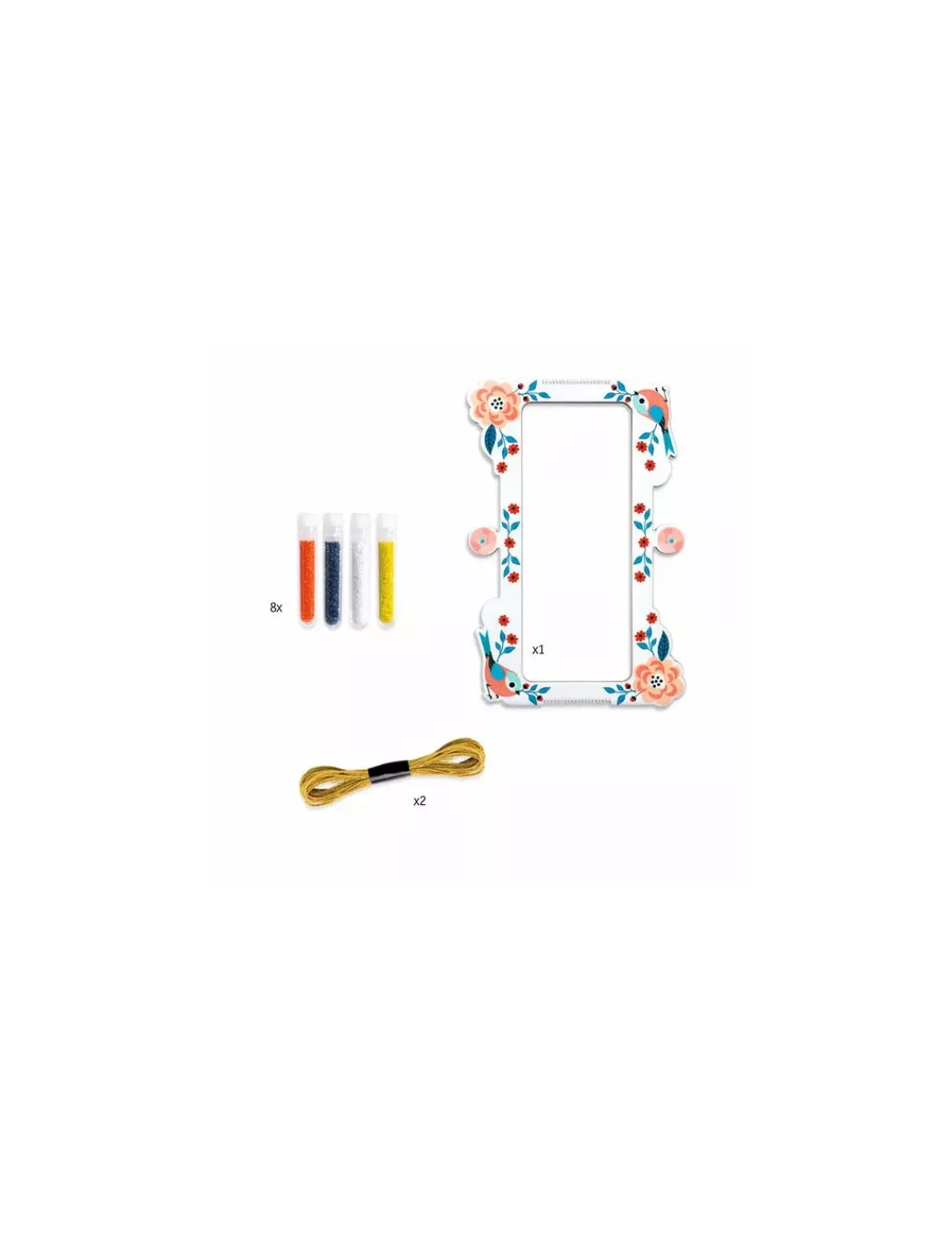 Ce coffret contient un métier à tisser, 8 tubes de perles de rocailles, 2 échevettes de fil et 1 livret d’exemples en couleurs.
