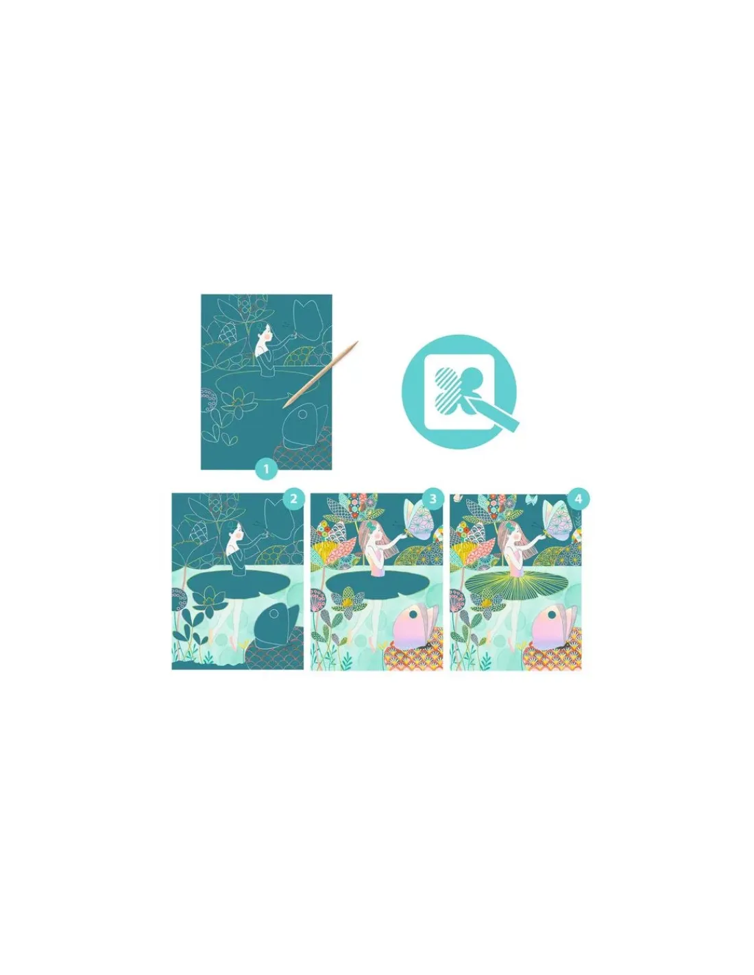 Une activité manuelle comprenant 4 cartes à gratter aux reflets irisés pour une douce balade pleine de surprises au fil de l’eau. En suivant le livret d’instructions, l’enfant reproduit les motifs imaginés par l’artiste en grattant la surface de la carte à l’aide du stylet en bois.