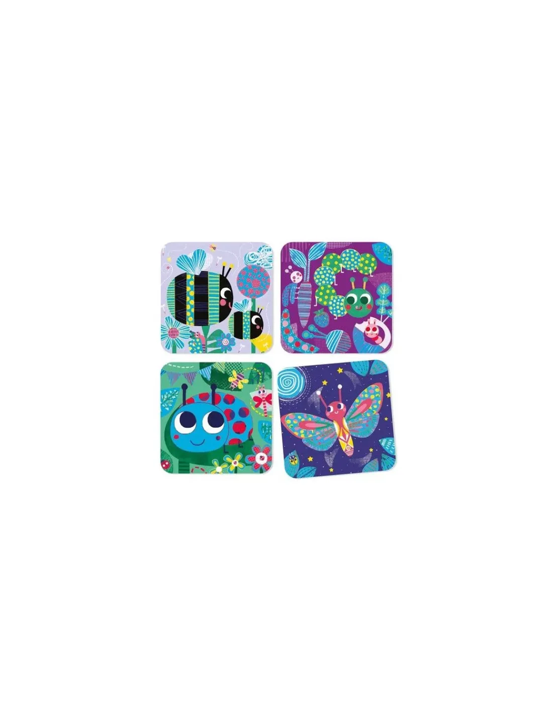 Suivez le livret d’instruction et grattez la surface de la carte pour créer pas à pas 4 magnifiques tableaux avec des petites bêtes: papillon, chenille, coccinelle et abeille.