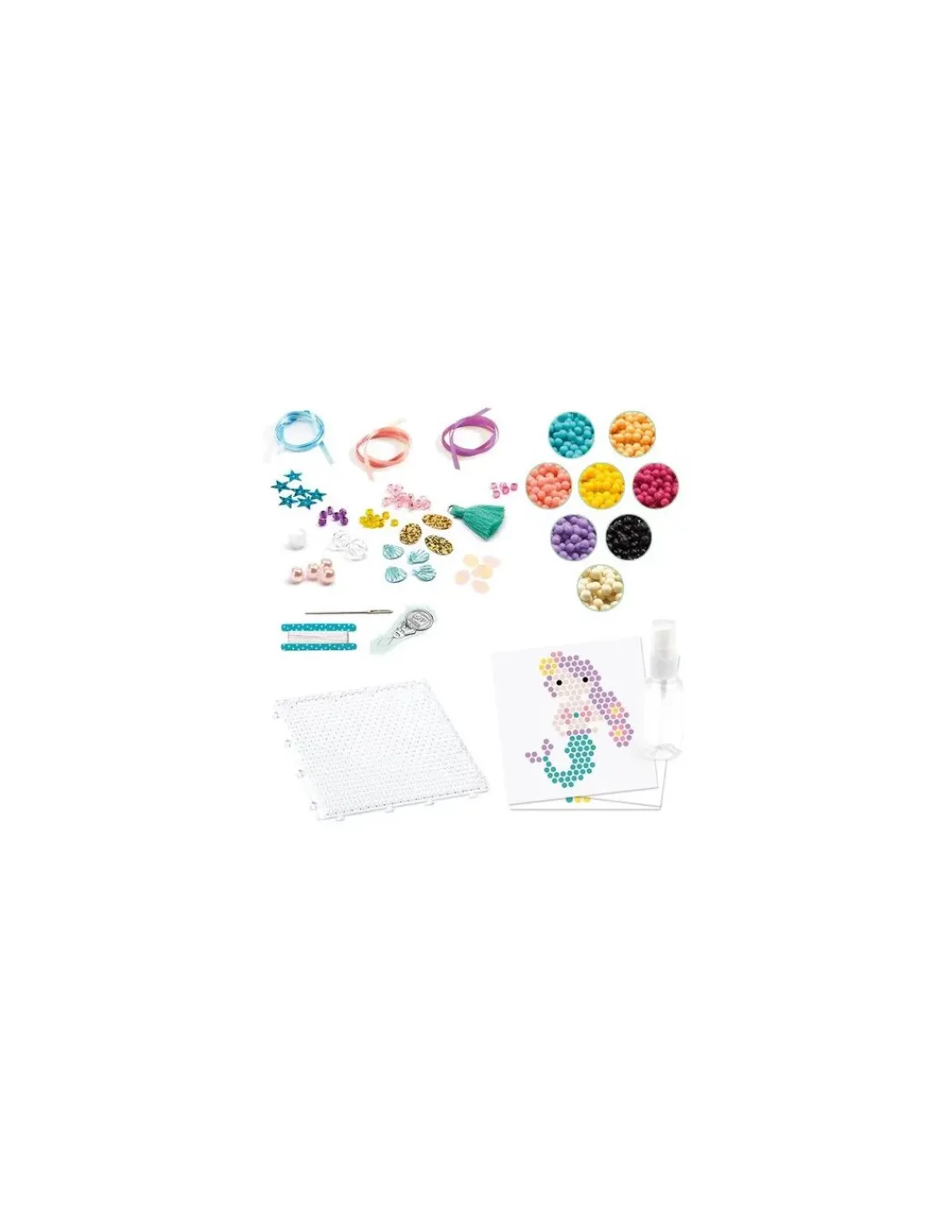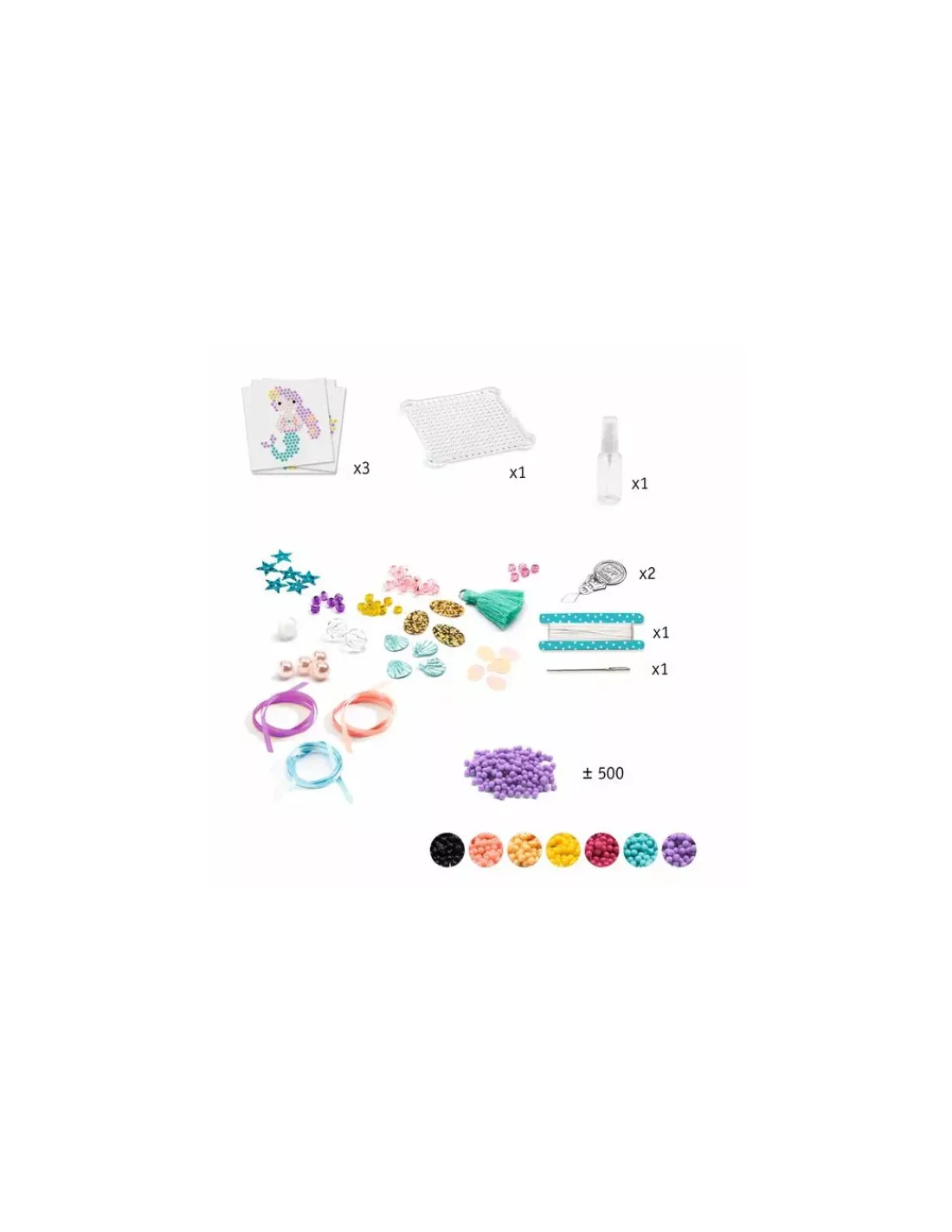 Le coffret contient 3 modèles, un socle, un pulvérisateur, environ 500 perles, un passe fil, du fil, une aiguille, plein d’accessoires pour customiser vos créations et une notice.