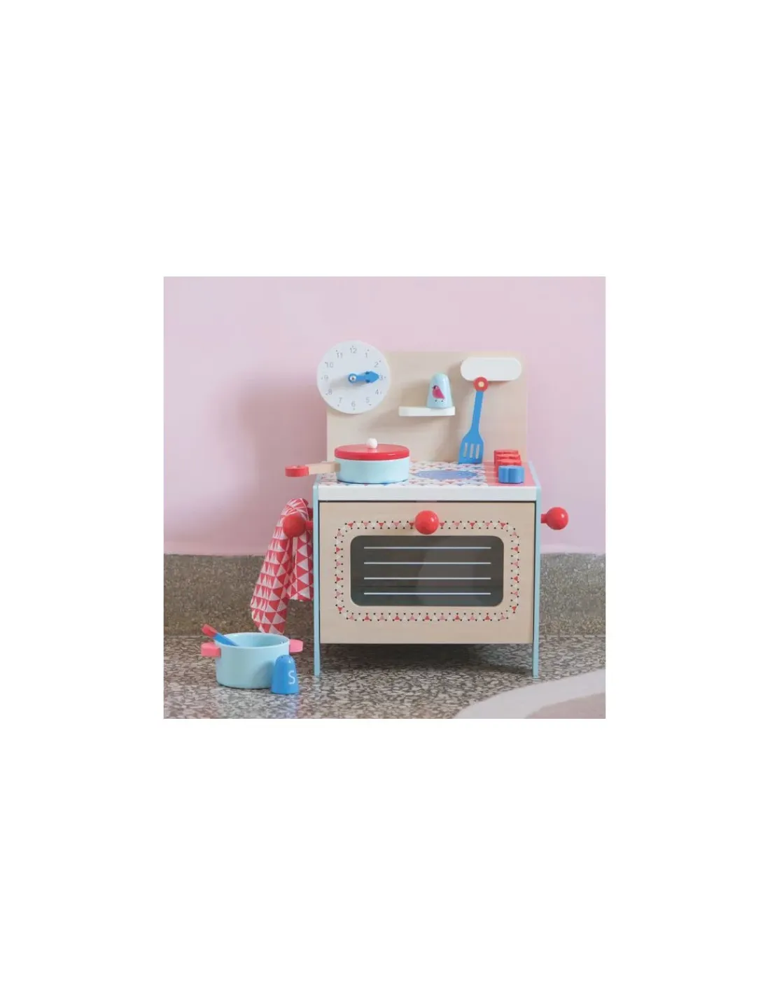 Le coffret contient une cuisinière et ses accessoires en bois : 1 poêle, 1 casserole avec 1 couvercle, 1 salière, 1 poivrière, 2 ustensiles (cuillère et spatule) et 1 torchon imprimé. La porte du four est magnétique.