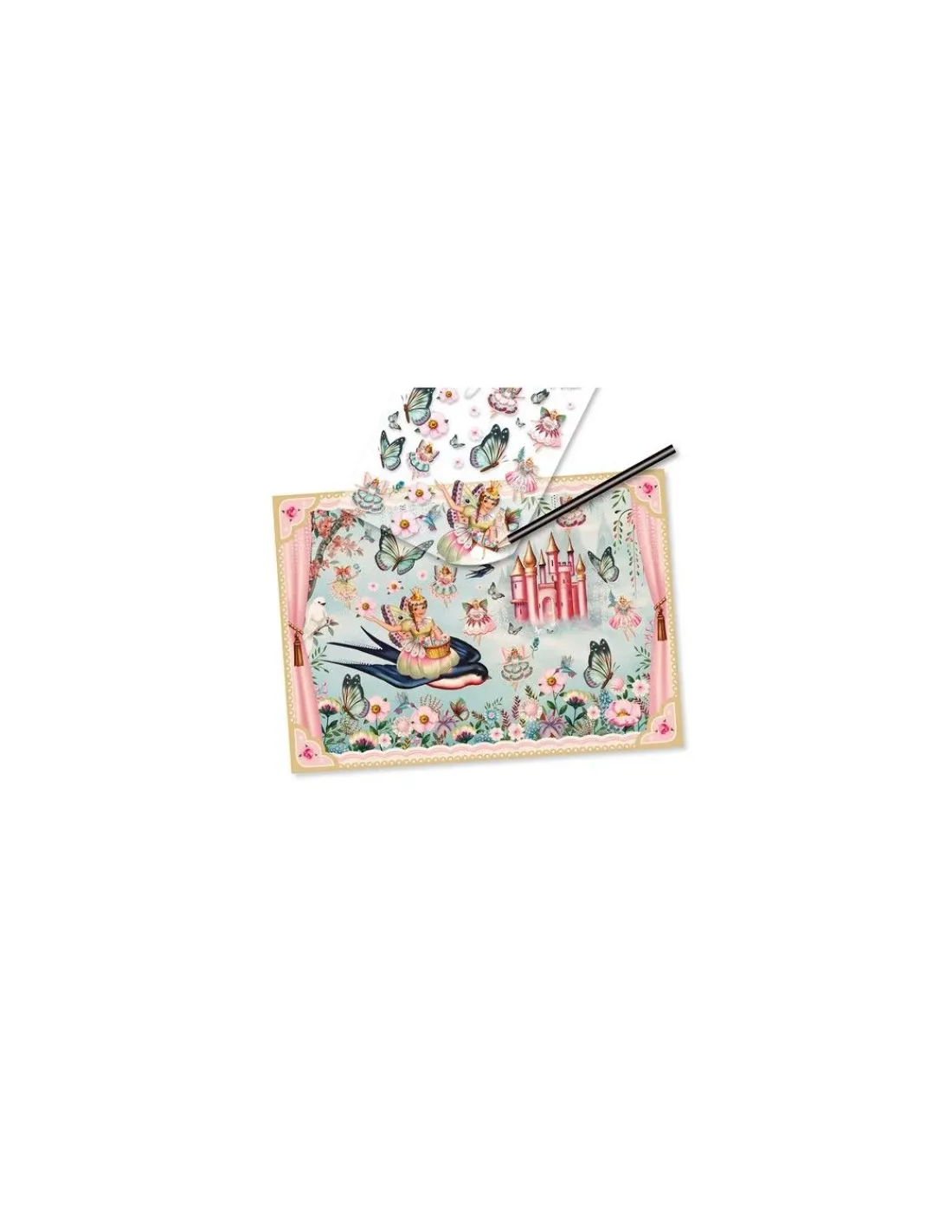 Une grande pochette contenant une multitude de décalcomanies et 3 grands fonds illustrés à compléter sur le thème fascinant des fées ! L’enfant choisit un décor et positionne dessus les éléments à transférer. À l’aide d’un crayon, il frotte les images pour les déposer à l’endroit choisi. Une activité facile et amusante pour créer librement des tableaux féériques.