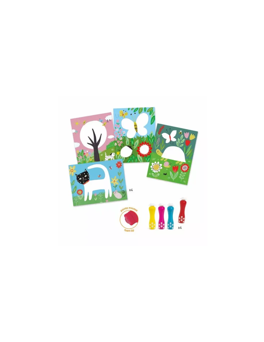 Ce coffret comprend 4 tableaux illustrés (28 x 21,4 cm) et 4 marqueurs mousse, de gros feutres faciles à tenir avec une encre lavable pour ne tâcher ses vêtements ou ses mains.