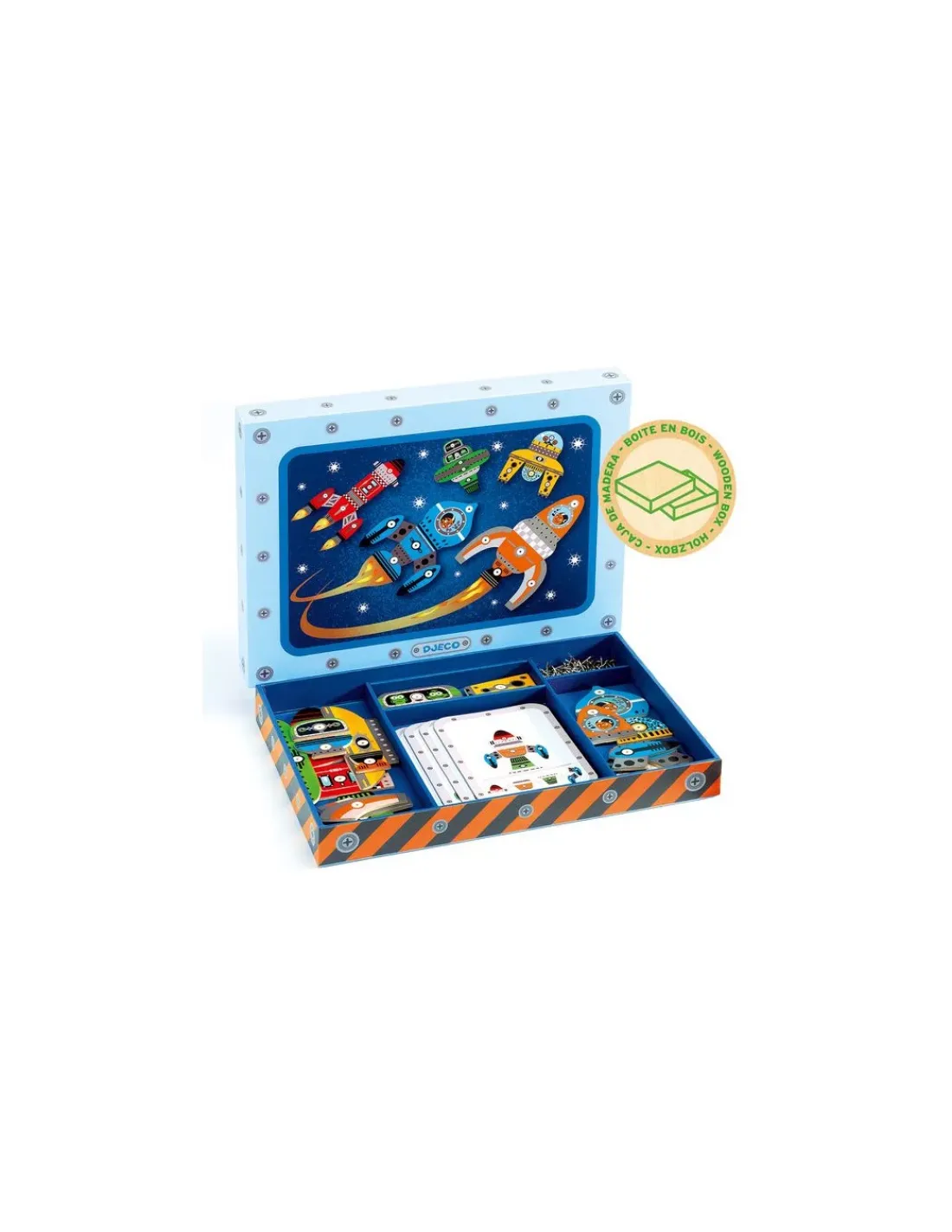 L’enfant construit ses propres fusées et navettes spatiales en plaçant les pièces sur le support en liège et en les fixant à l’aide des petits clous et du marteau. Il reproduit les modèles ou fait appel à son imagination pour créer ses propres navettes spatiales à l’infini, le tout dans une jolie boîte en bois!