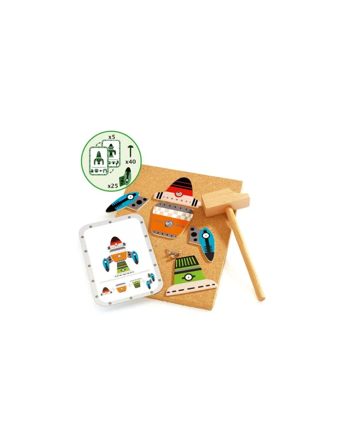 La boite contient 24 pièces en bois illustrées et trouées, des clous, 1 planche de liège, 1 marteau en bois et 5 cartes modèle.
