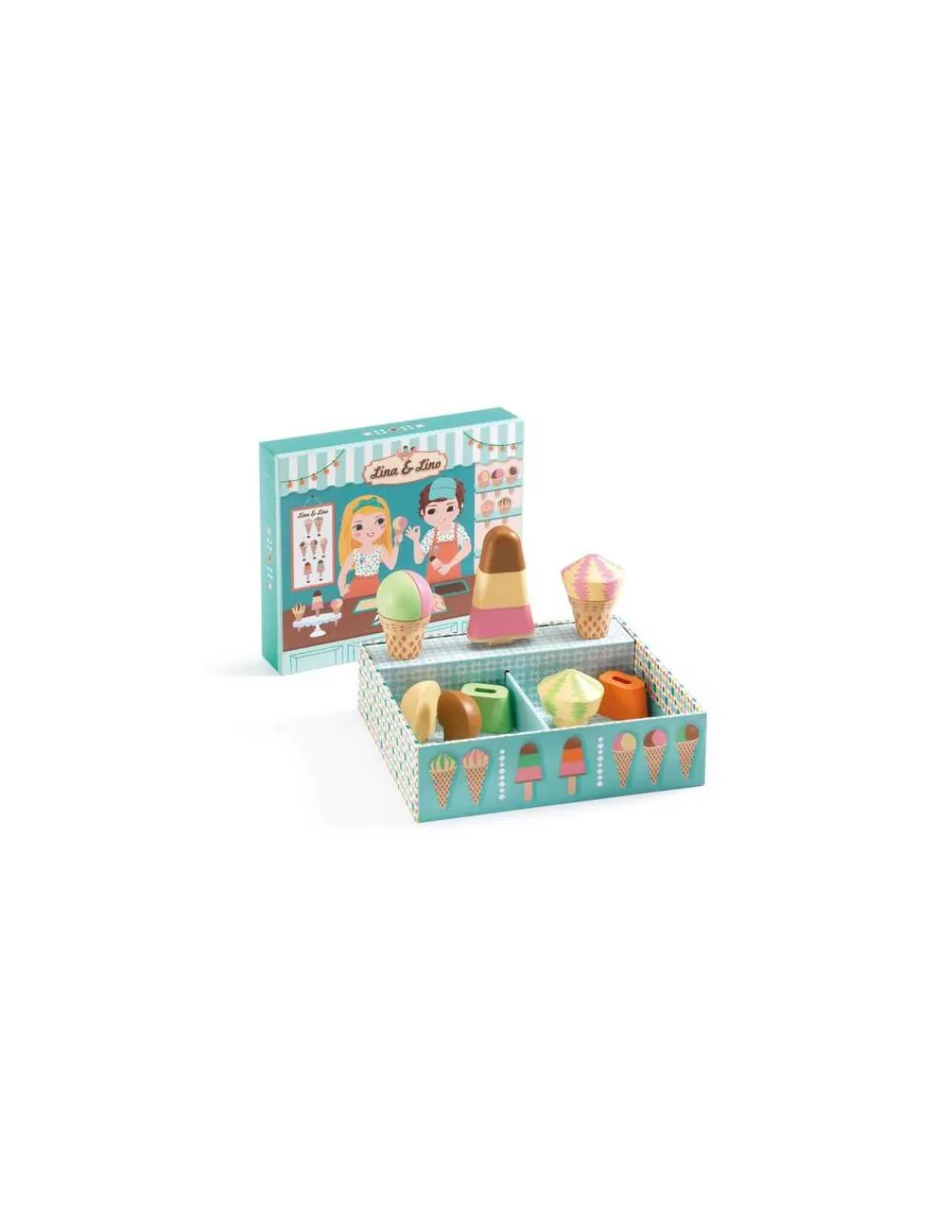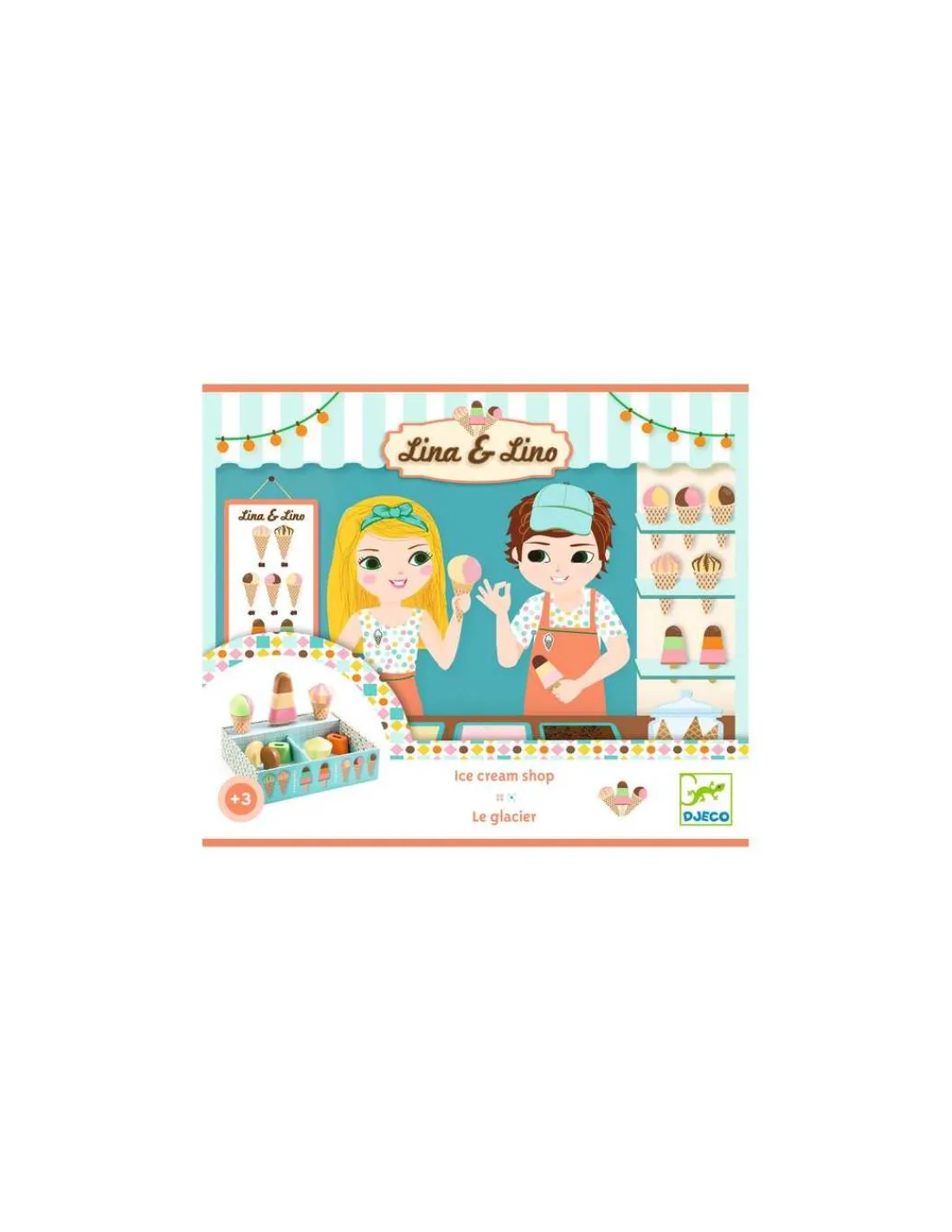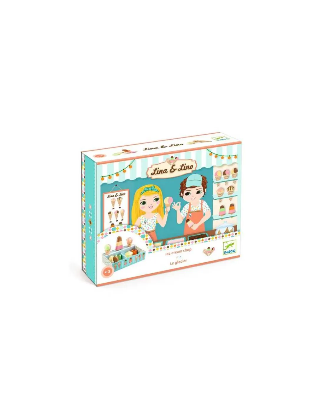 Venez déguster les délicieuses glaces de Lina et Lino! Dans cette jolie boîte en bois aux saveurs italiennes, l’enfant prend commande de glaces, les prépare et les présente à ses petits clients sur les supports prévus à cet effet. Cornet chocolat citron, cône vanille fraise ou esquimau 3 parfums, le choix va être difficile!
