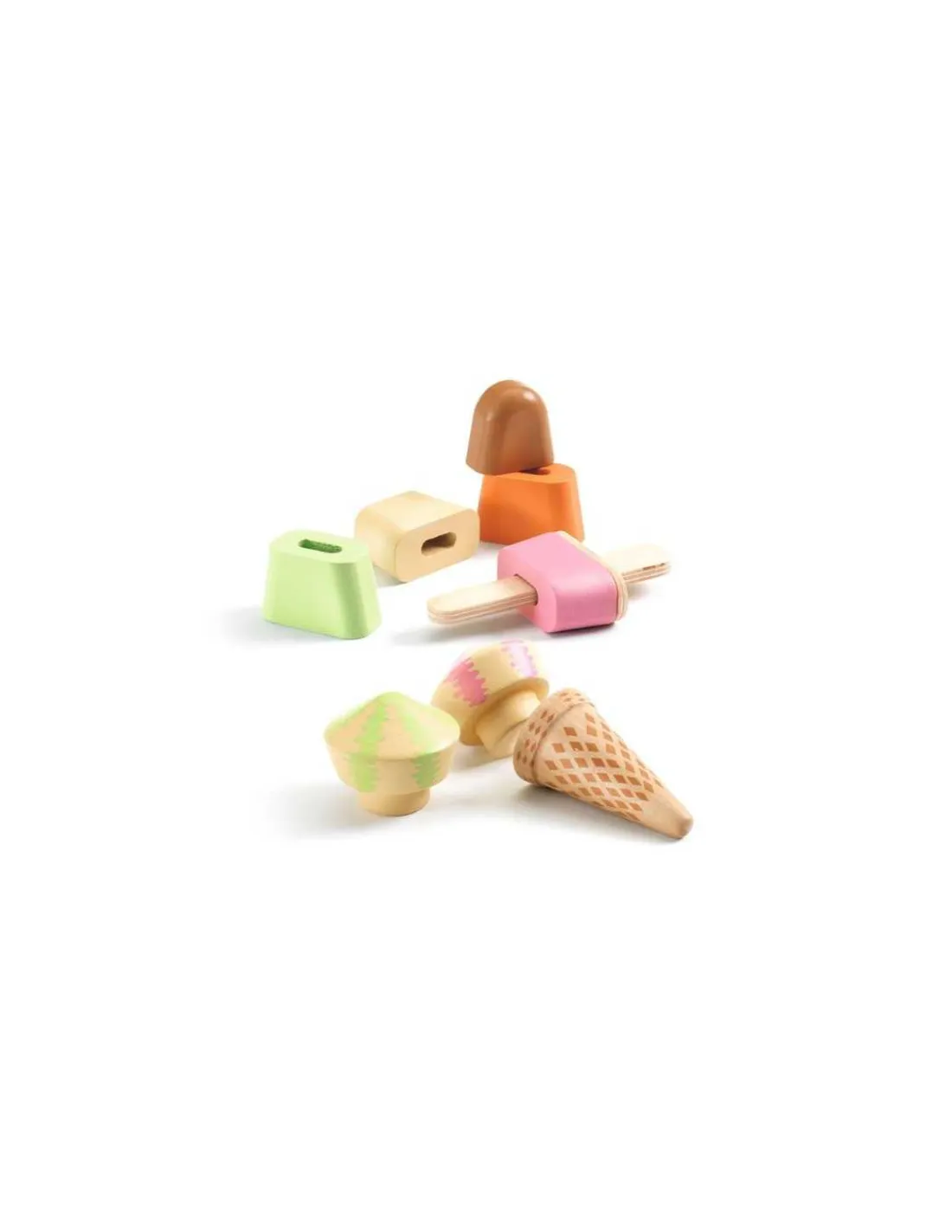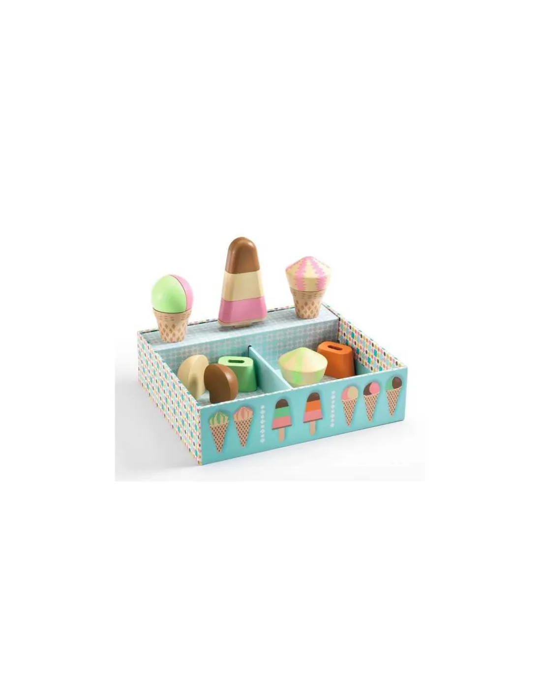 Découvrez le coffret Glacier Chez Lina & Lino de Djeco, un ensemble de jouets en bois pour jouer à la dinette. Un joli cadeau à offrir aux enfants dès 3 ans.