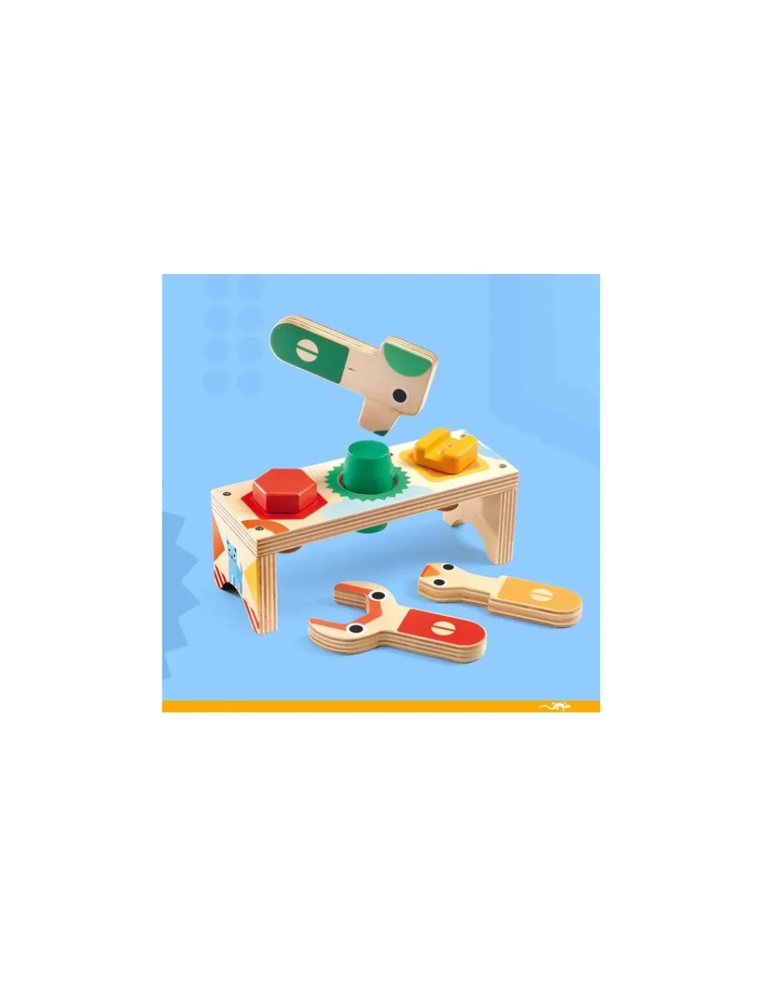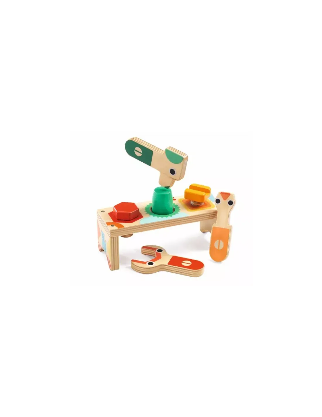 Découvrez Bricolou de Djeco, un jouet d’éveil en bois pour les enfants à partir de 18 mois. Un jeu de motricité avec un mini établi pour exercer la motricité de votre bébé.