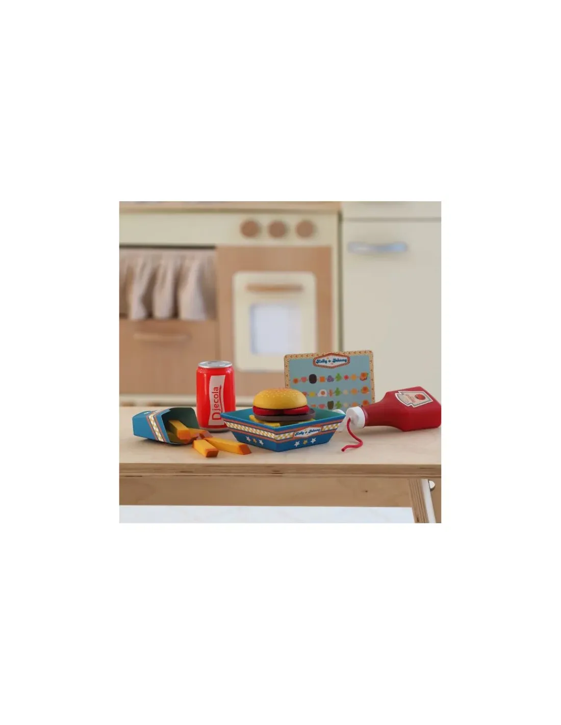 Découvrez la dinette burgers Kelly & Johnny de Djeco, le petit atelier fast food pour jouer à la dinette, un cadeau pour jouer à la dinette à partir de 3 ans.