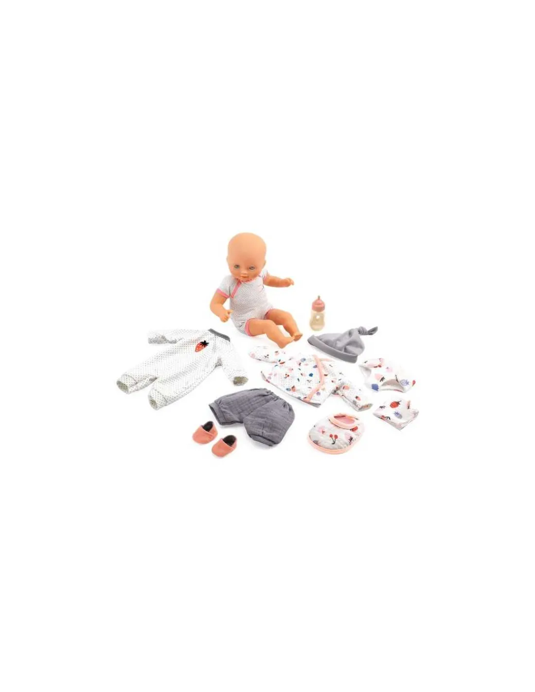 Le coffret contient 1 valise, 1 poupon de 32 cm (corps souple en tissu et tête, bras et jambes en vinyle), 1 pyjama, 1 bonnet, 1 haut cache-coeur, 1 bloomer, 1 paire de chaussons, 1 couche, 1 lingette, 1 biberon et 1 bavoir.