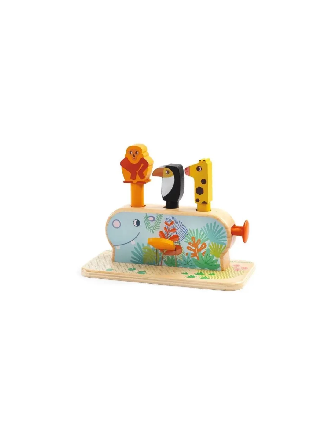 Votre bout de chou va s’amuser à placer les animaux dans les trous, puis à appuyer sur la tête du singe pour le faire bondir, à taper sur le levier pour faire sauter le toucan et à pousser le poussoir pour faire jaillir la girafe. Les sauts des animaux amuseront et feront rire votre bébé et vous allez voir ses yeux s’émerveiller!