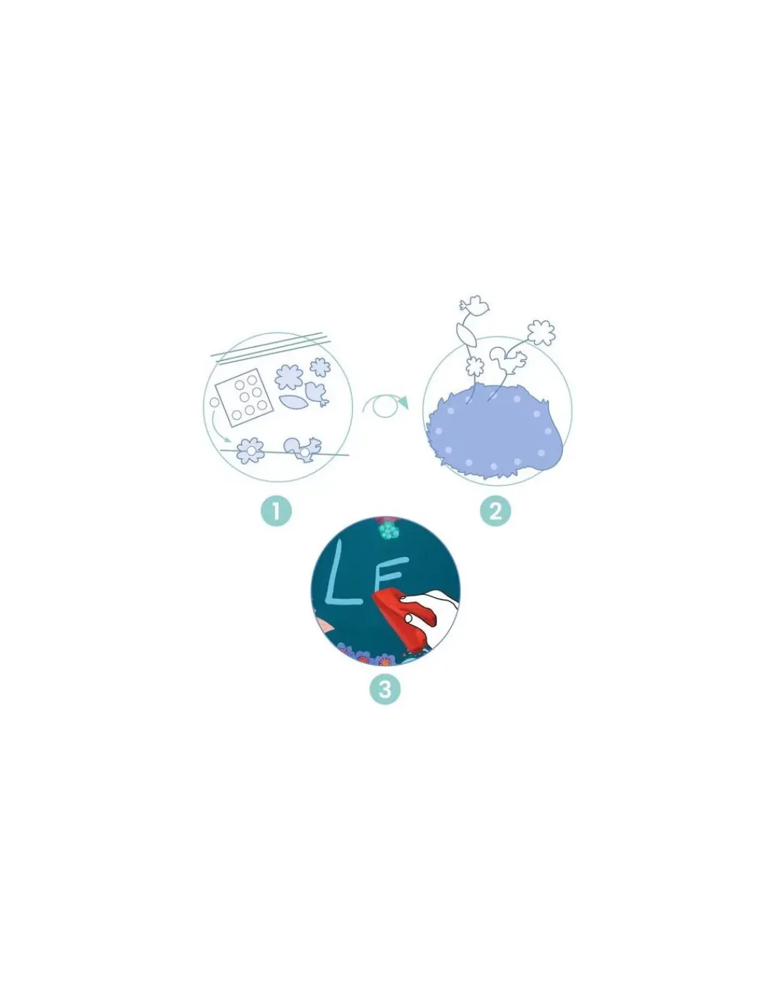 L’enfant colle les illustrations sur les tiges semi-rigides à l’aide des stickers en mousse épaisse, puis les assemble à l’ardoise, qui se transforme en un joli panneau décoratif réinscriptible. Un tableau original qui transforme le côté pratique du panneau effaçable en un bel objet de décoration.