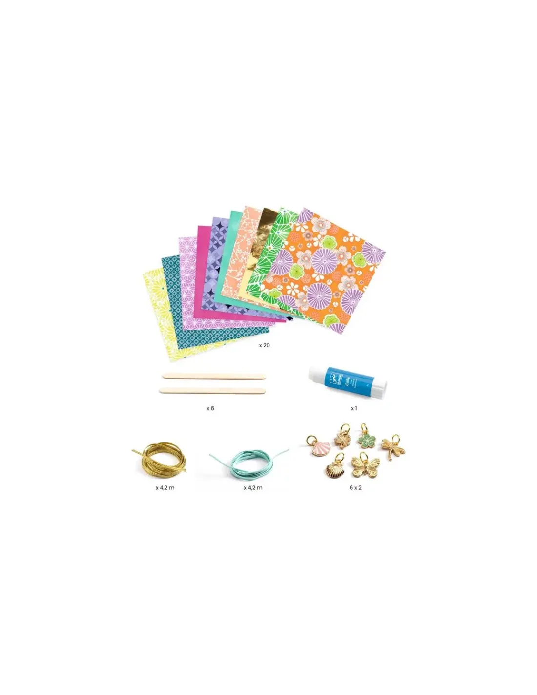 Le coffret comprend 20 feuilles de papier motifs et dorés (19 x 19 cm), 6 bâtonnets en bois, 1 fil élastique doré (4m20), 1 fil élastique bleu (4m20), 12 charms variés (papillons, libellules, coquillages, fleurs…), 1 bâton de colle, 1 livret d’explications pas à pas en couleurs.