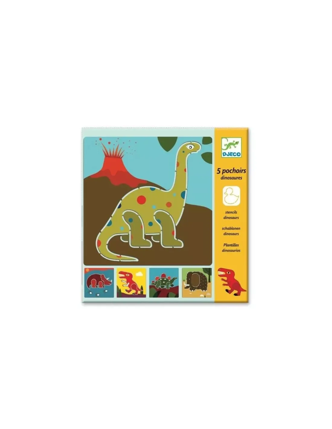 Découvrez les pochoirs « dinosaures » de Djeco, 5 plaques joliment imprimées sur du PVC avec des fentes pour bien guider le crayon et créer de jolis dinosaures. Des pochoirs pour les enfants de 4 à 8 ans.