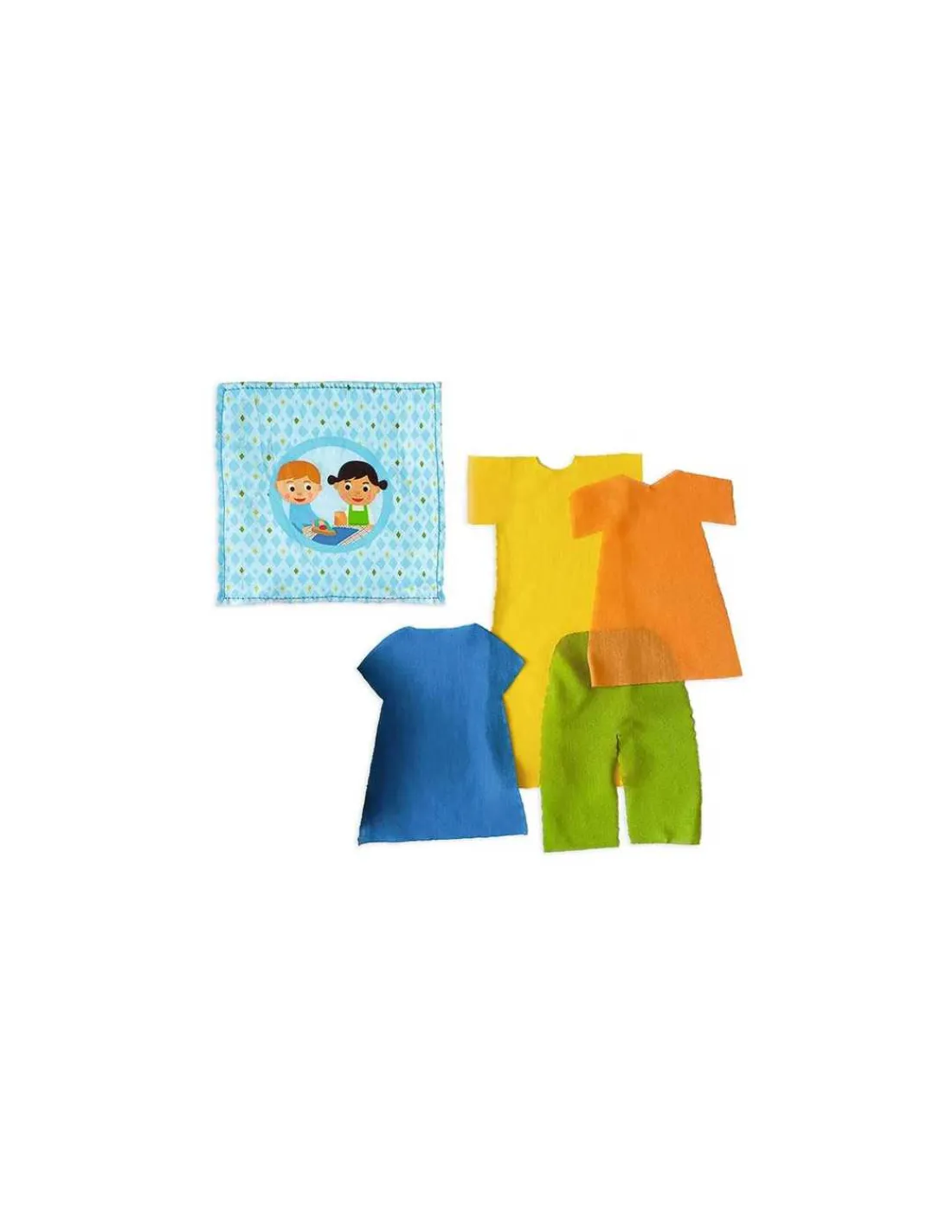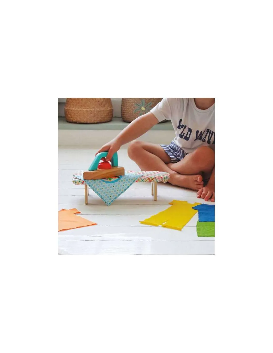 Le coffret comprend 1 petite table à repasser avec 4 pieds assemblés en bois, 1 housse en coton, 1 fer à repasser en bois, 5 vêtements en coton et polyuréthane et 1 nappe illustrée en coton.