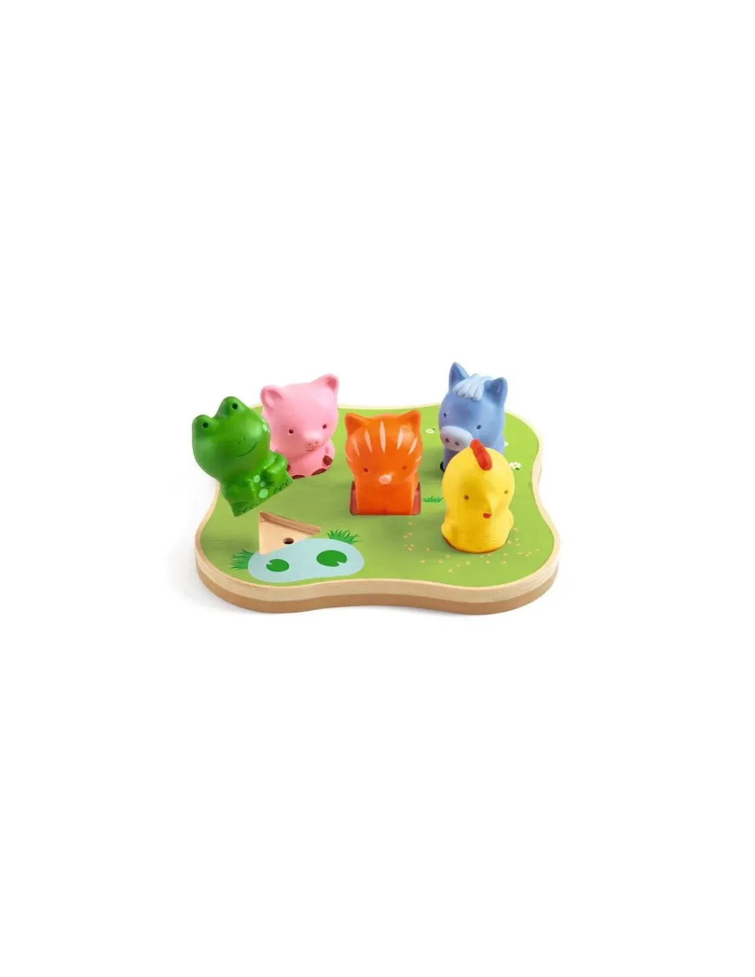 Découvrez le puzzle sonore Caconimo de Djeco, un puzzle en bois musical pour les enfants dès 12 mois. Un puzzle d’encastrement sonore avec 5 animaux de la ferme en volume.