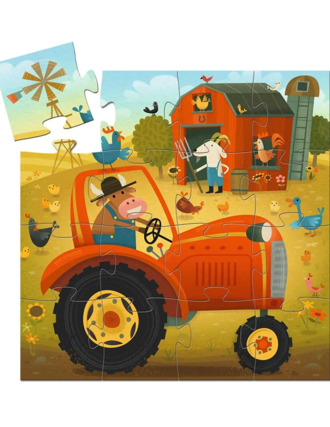 Découvrez le puzzle Tracteur de Djeco, un magnifique puzzle de 16 pièces pour les enfants dès 3 ans, présenté dans une boite silhouette tout en rondeur.