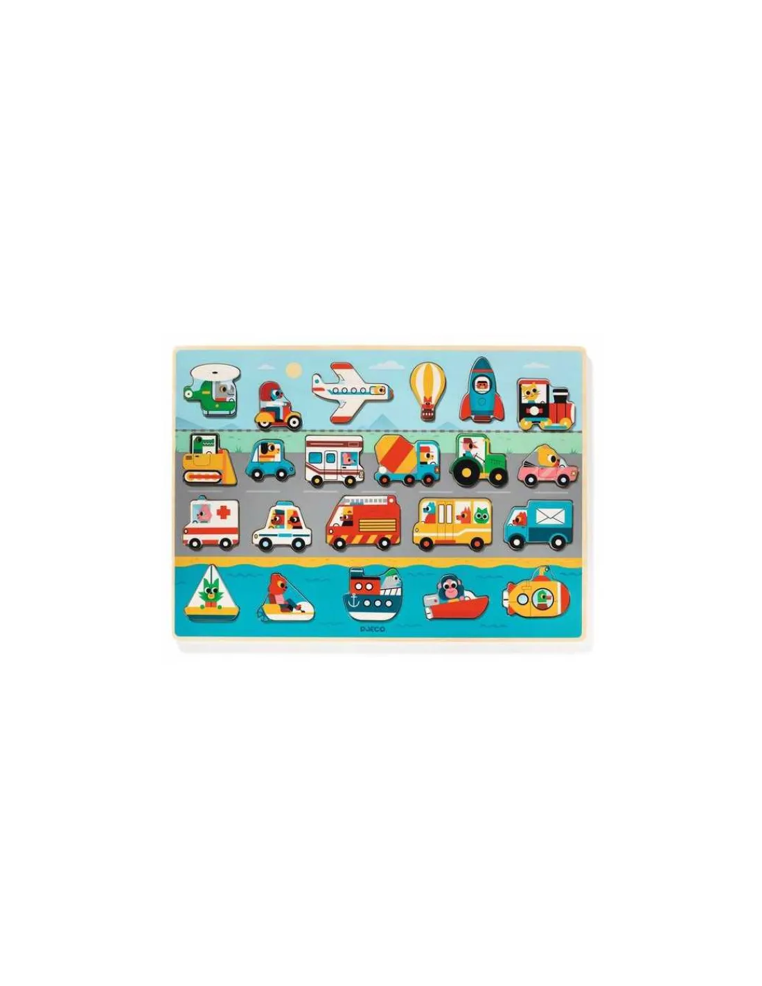 Un puzzle d’encastrement avec 22 pièces en forme de véhicule, faciles à attraper et à replacer sur le socle en bois. Avion, fusée, voiture, tracteur, ambulance, voiture de police, camion de pompier, bateau, sous-marin… l’enfant replace les pièces à la bonne place en observant la silhouette du véhicule. Un jouet en bois qui permet aux enfants de développer leur dextérité, leur logique et leur imaginaire.