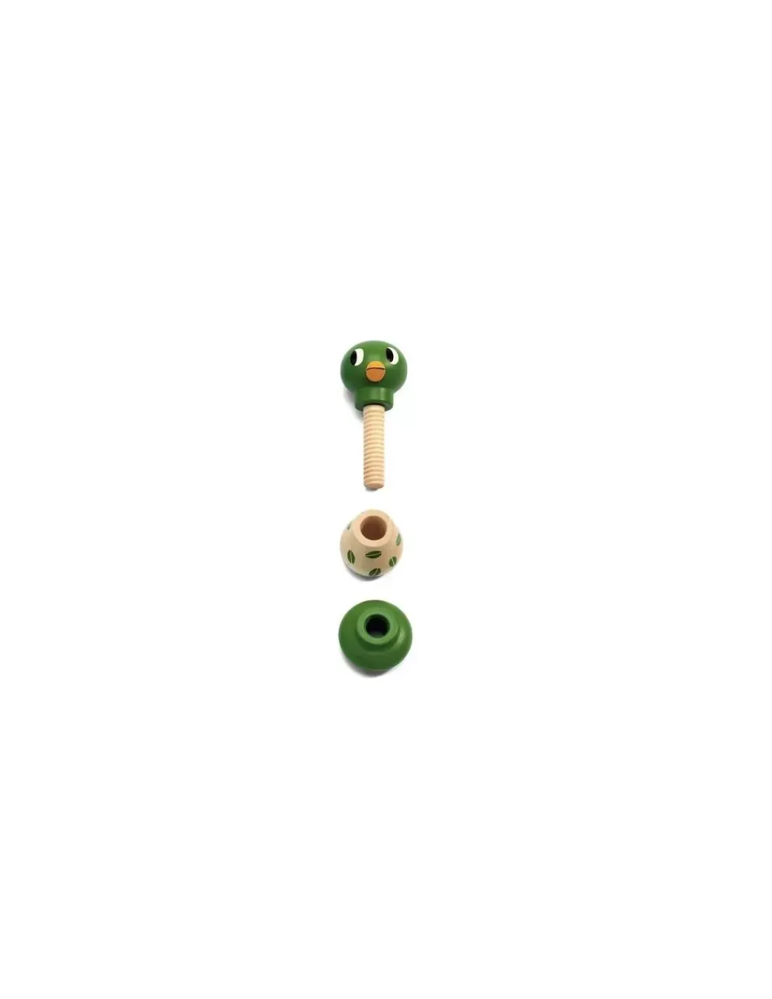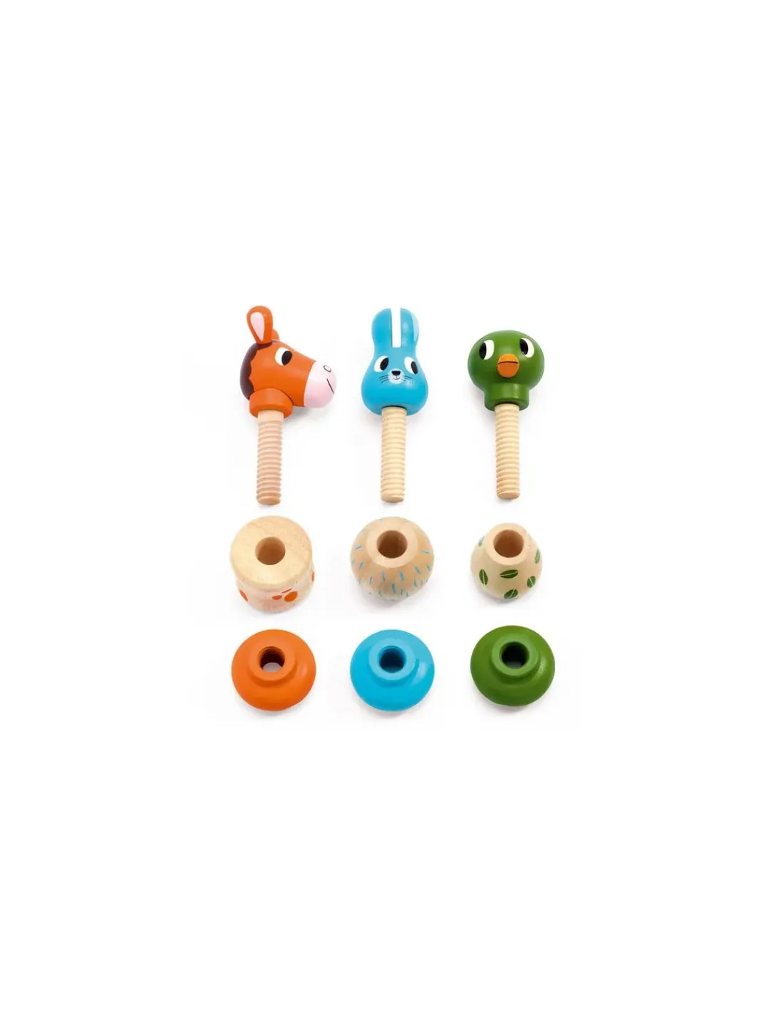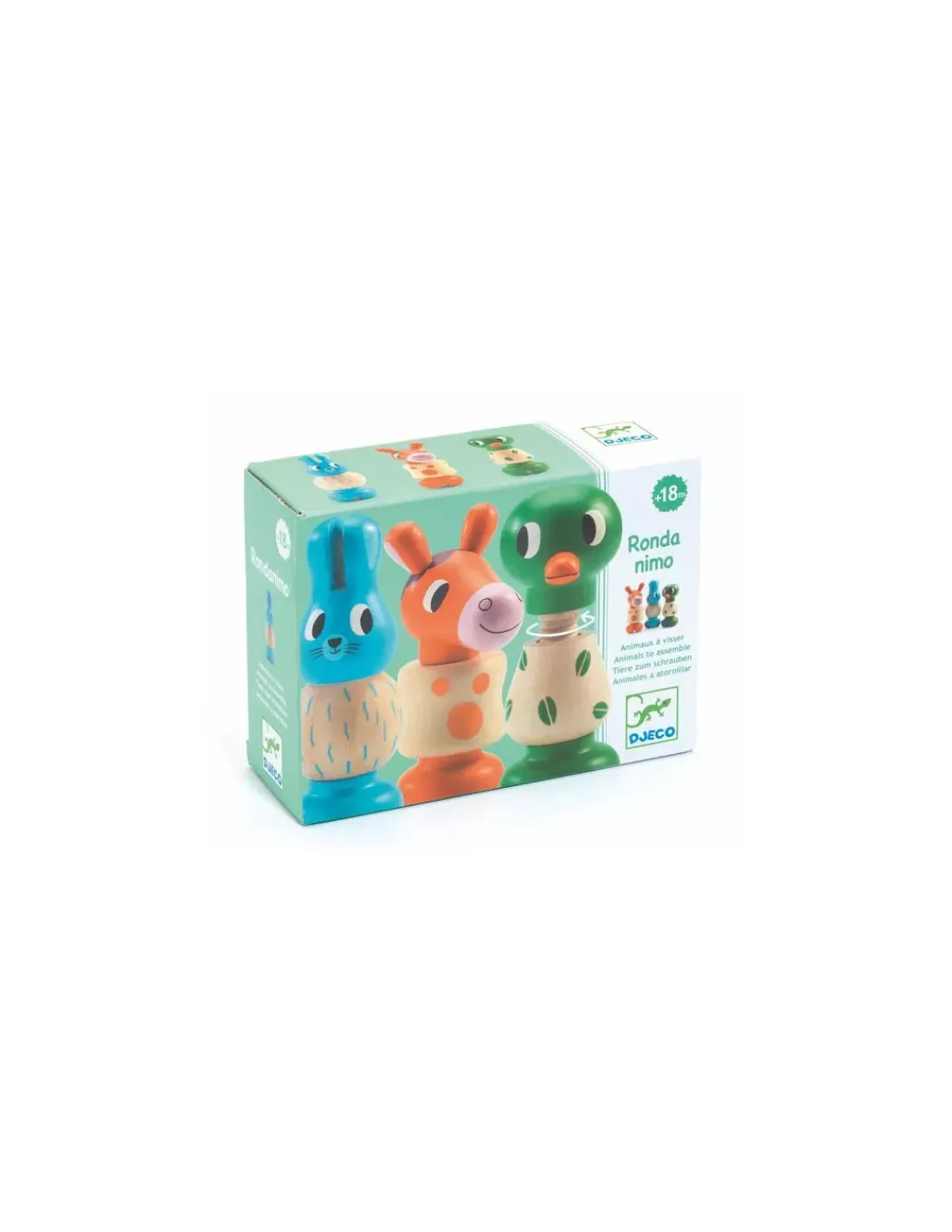 Découvrez Rondanimo de Djeco, un jeu de manipulation composé de 3 animaux en bois à visser pour développer la dextérité de bébé dès 18 mois.
