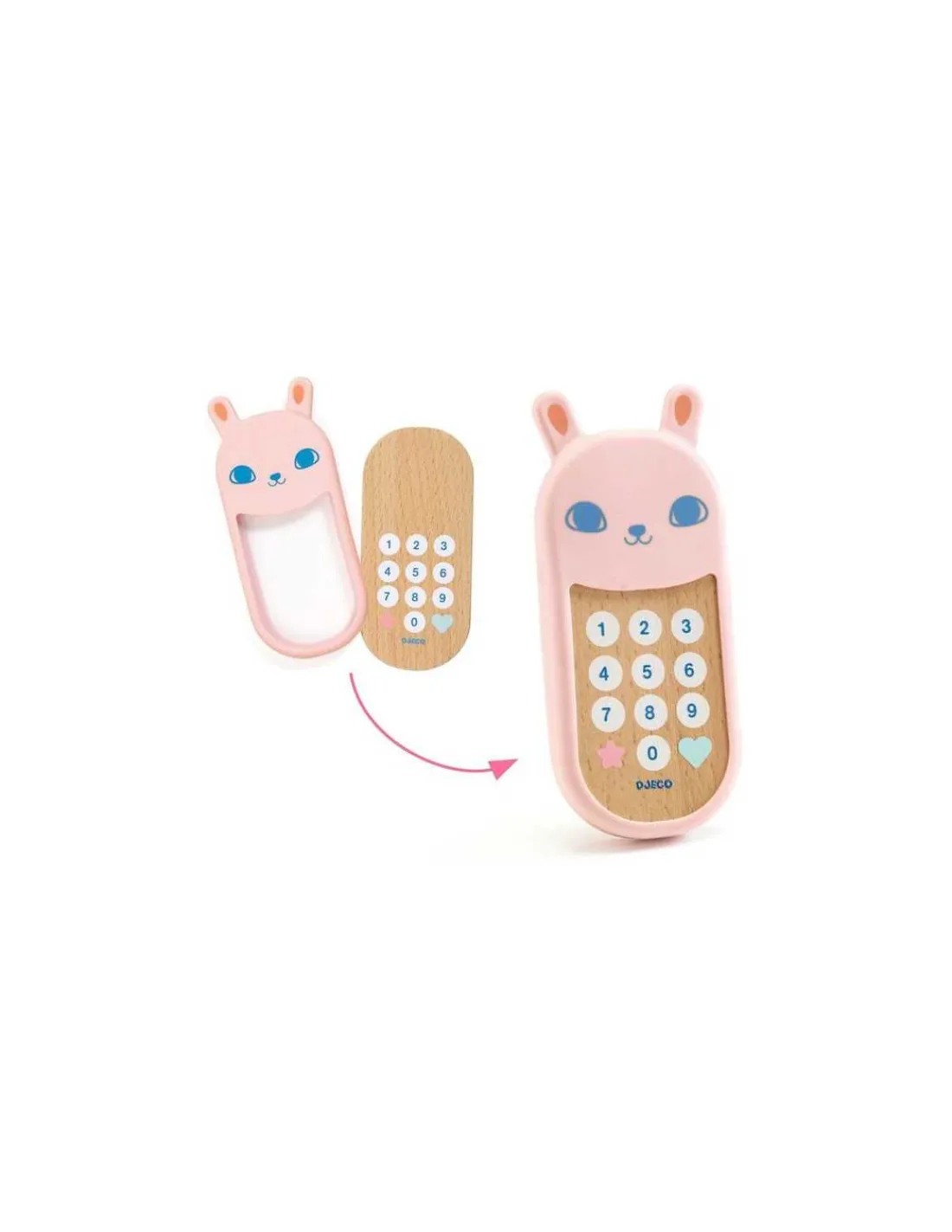Le coffret contient 1 sac à main en tissu brodé avec des accessoires : 1 téléphone et sa coque lapin, 1 trousseau de 3 clés et 1 montre en bois avec un bracelet élastique pour un enfilage facile.