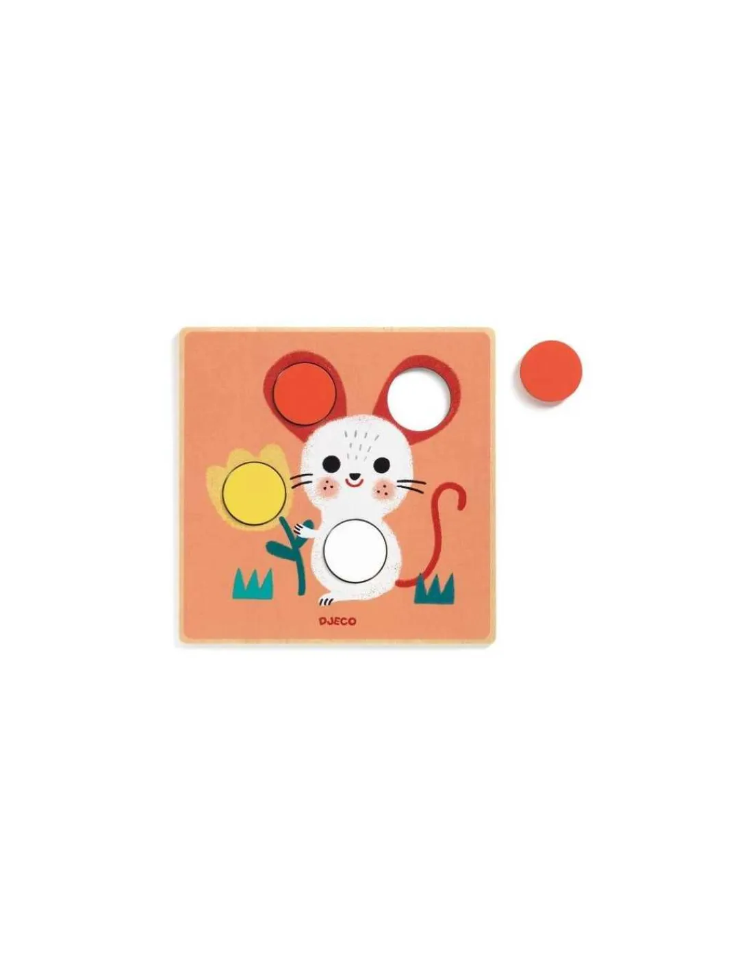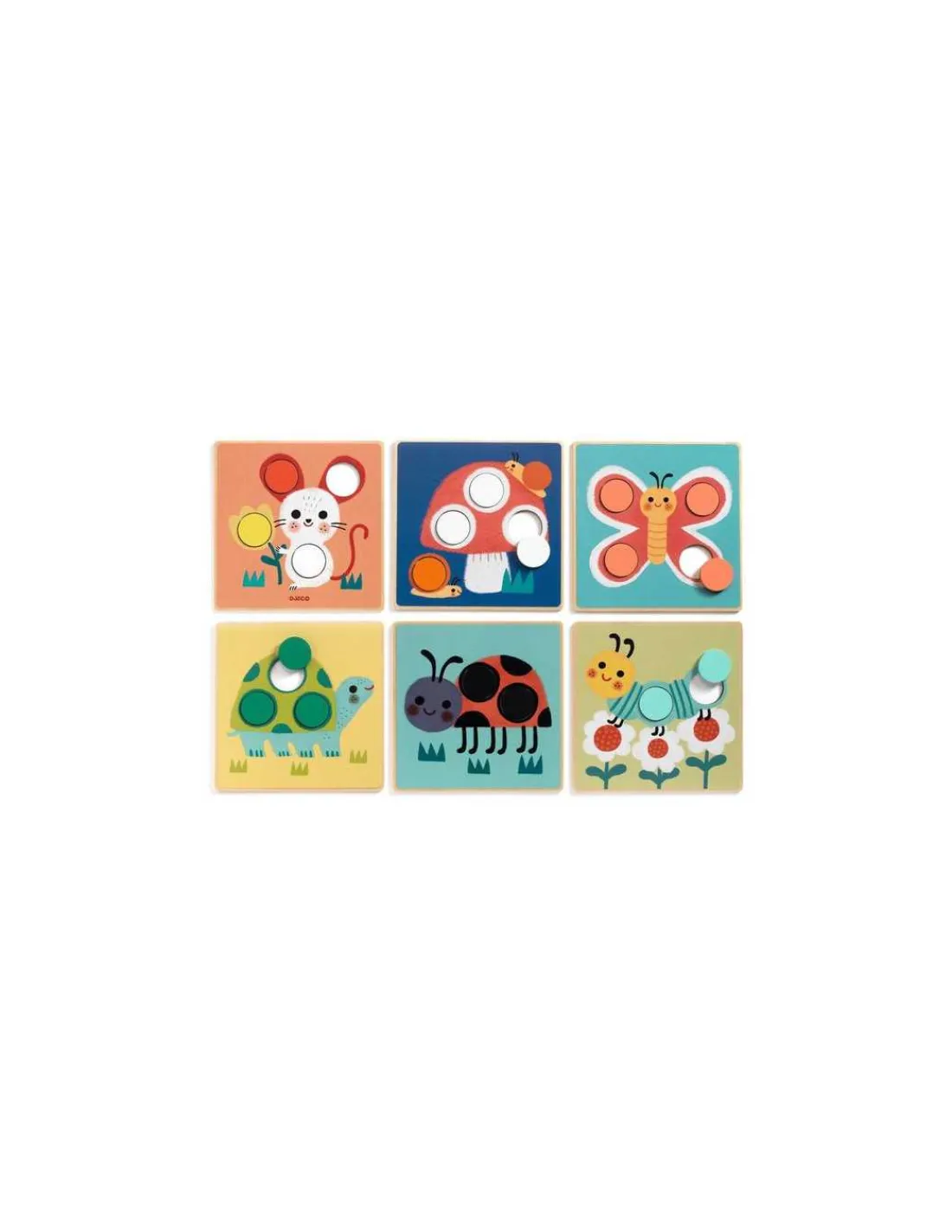 L’enfant choisit une planche illustrée avec 2, 3 ou 4 trous et place dans chaque trou le jeton de la couleur correspondante pour compléter l’image. Les jetons, épais et faciles à attraper, sont spécialement conçus pour les petites mains. Le jeu comprend 6 planches en bois joliment illustrées et 19 jetons colorés en bois.