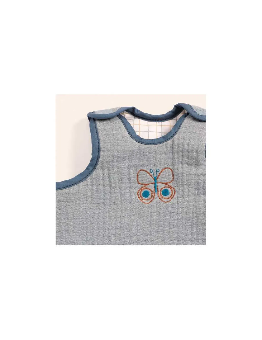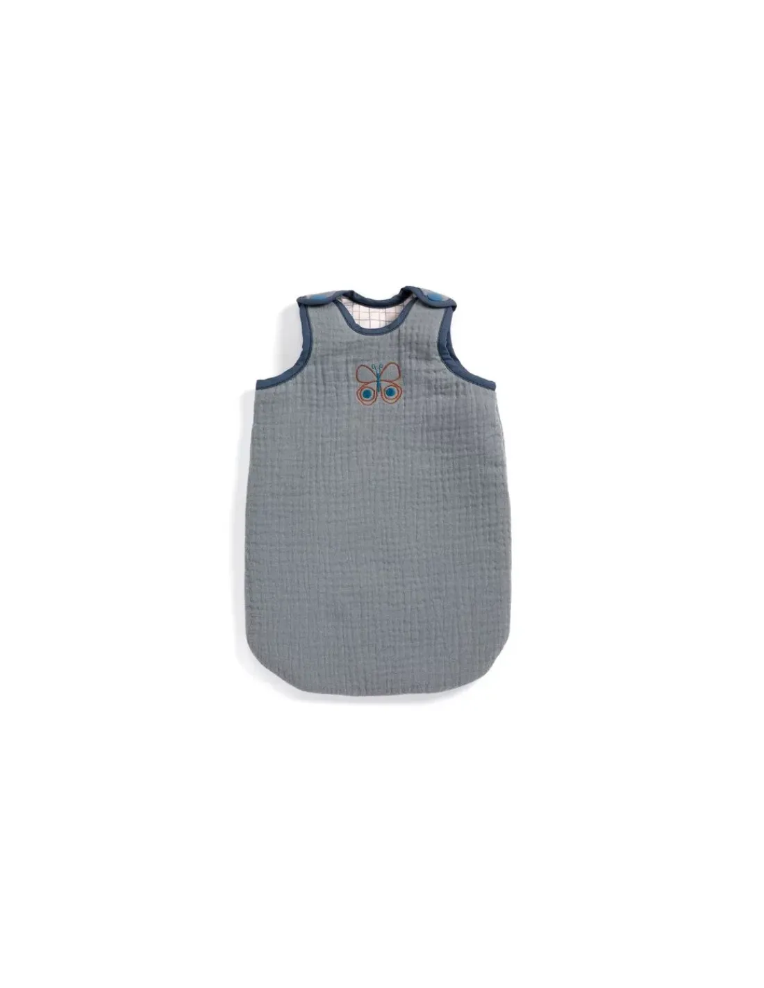 Une jolie turbulette bleue avec un papillon brodé pour que bébé passe une bonne nuit et ne se découvre pas. Avec ses scratchs aux épaules, il est très facile d’y glisser son compagnon. Une turbulette de qualité et tendance, en coton ouaté imprimé à l’intérieur et double gaze brodé à l’extérieur adapté aux poupons de 30 à 36 cm.