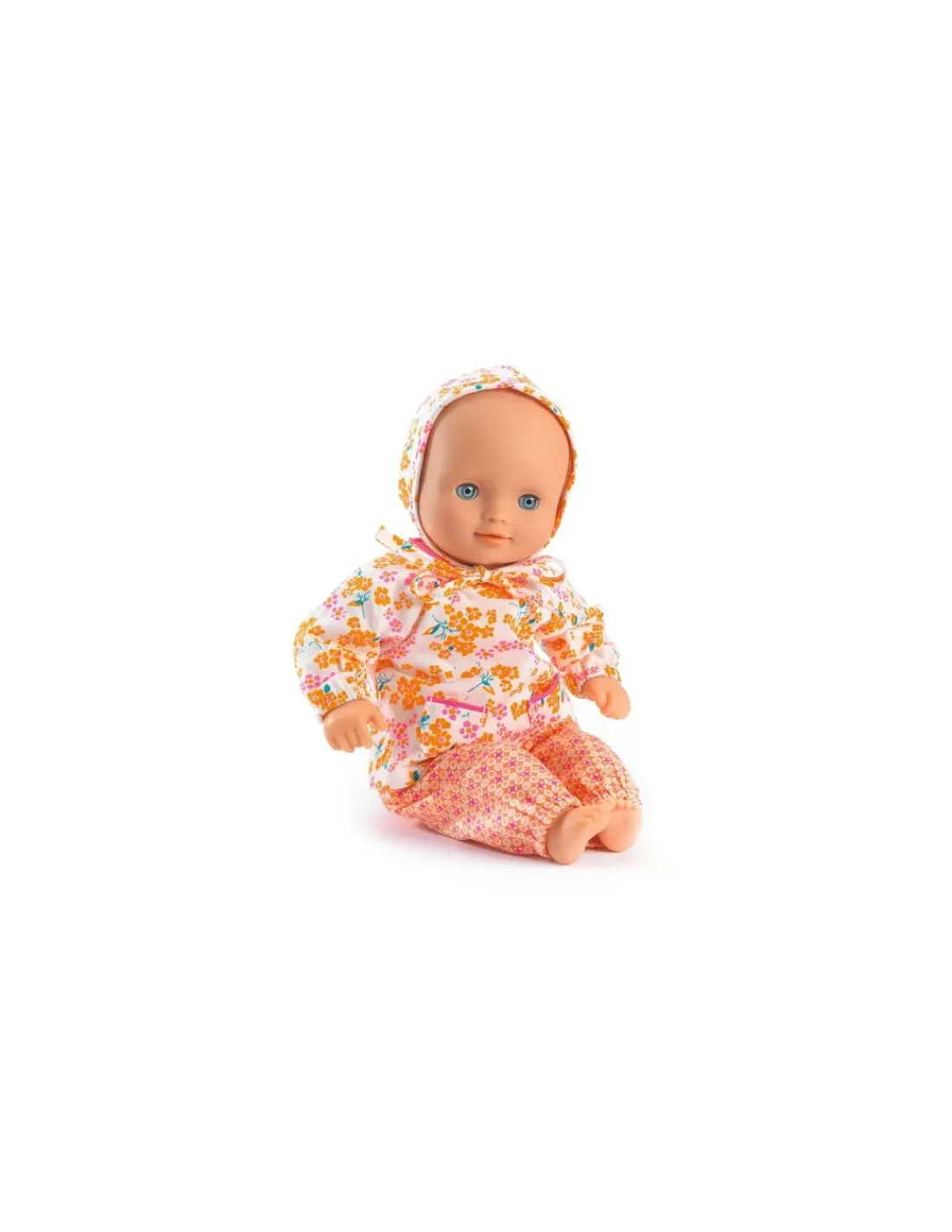 Un ensemble 3 pièces léger aux imprimés fleuris et colorés, parfait pour une balade estivale. Un pantalon à taille élastique et une chemise fleurie qui se ferme avec des scratchs dans le dos permettent aux petits parents d’habiller facilement la poupée. Le béguin complète joliment cette tenue pour protéger les bébés du soleil.