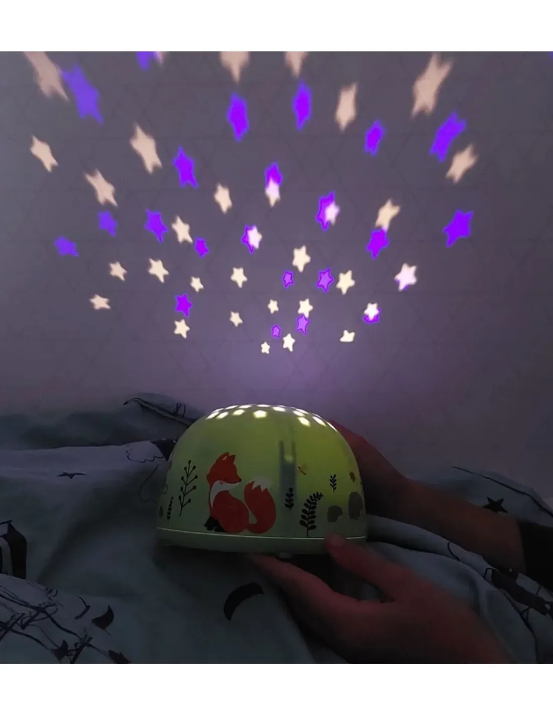 Une magnifique veilleuse sur laquelle vous pourrez définir la couleur des étoiles: arc-en-ciel, orange, vert ou bleu.