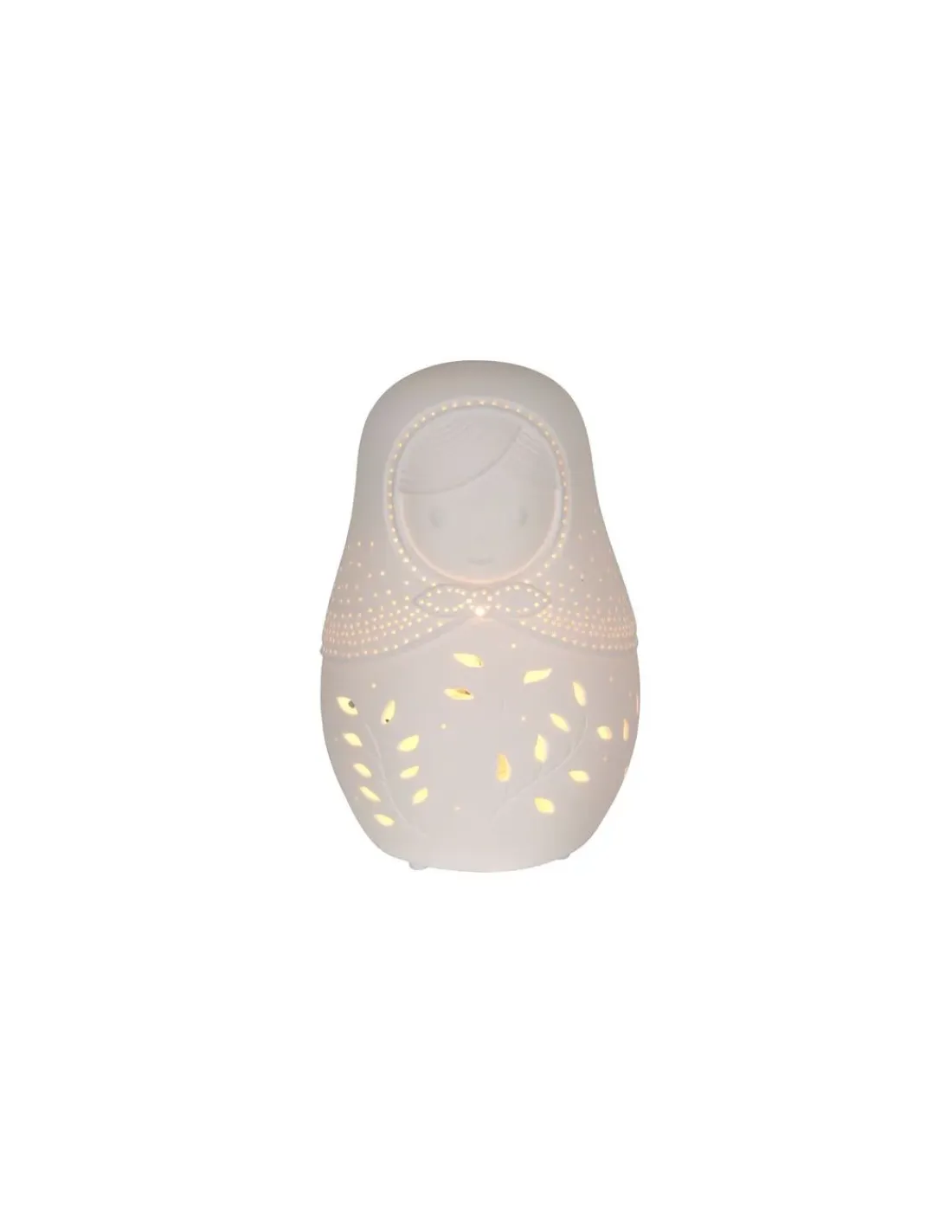 Découvrez la lampe Babouchka en porcelaine de Amadeus Les Petits, une douce veilleuse ajourée pour décorer la chambre et apaiser les nuits de bébé en diffusant une douce lumière. Sa lumière douce et réconfortante apportera une touche cosy et une originalité singulière.