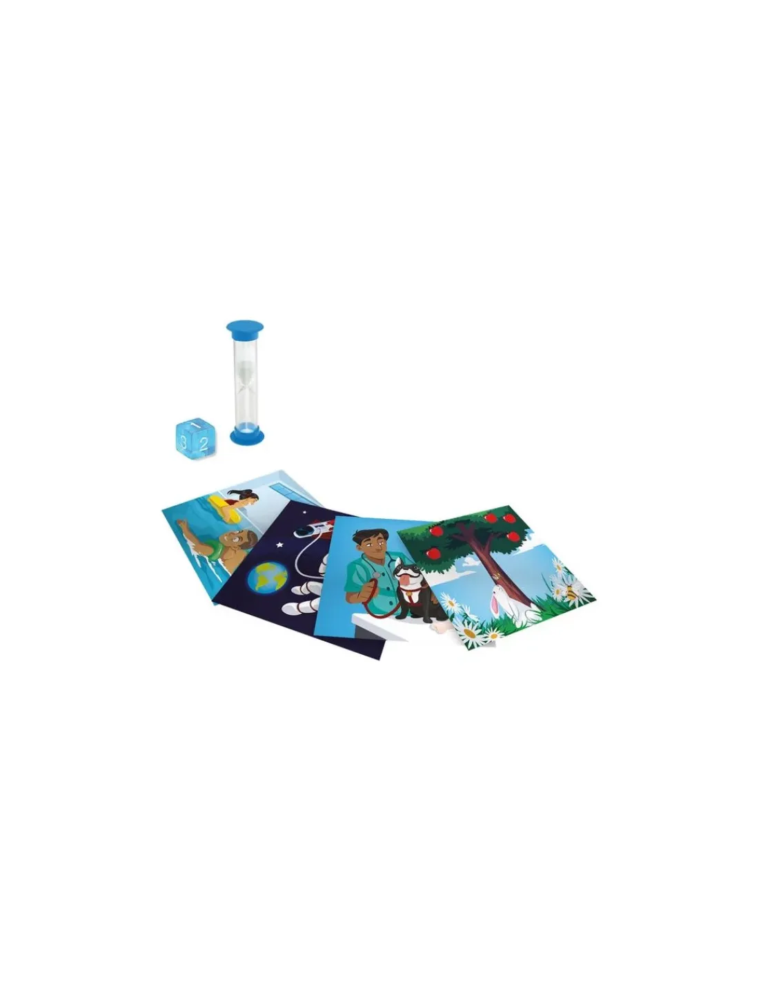 La boîte de jeu contient 55 cartes, un sablier, un dé et la règle de jeu.