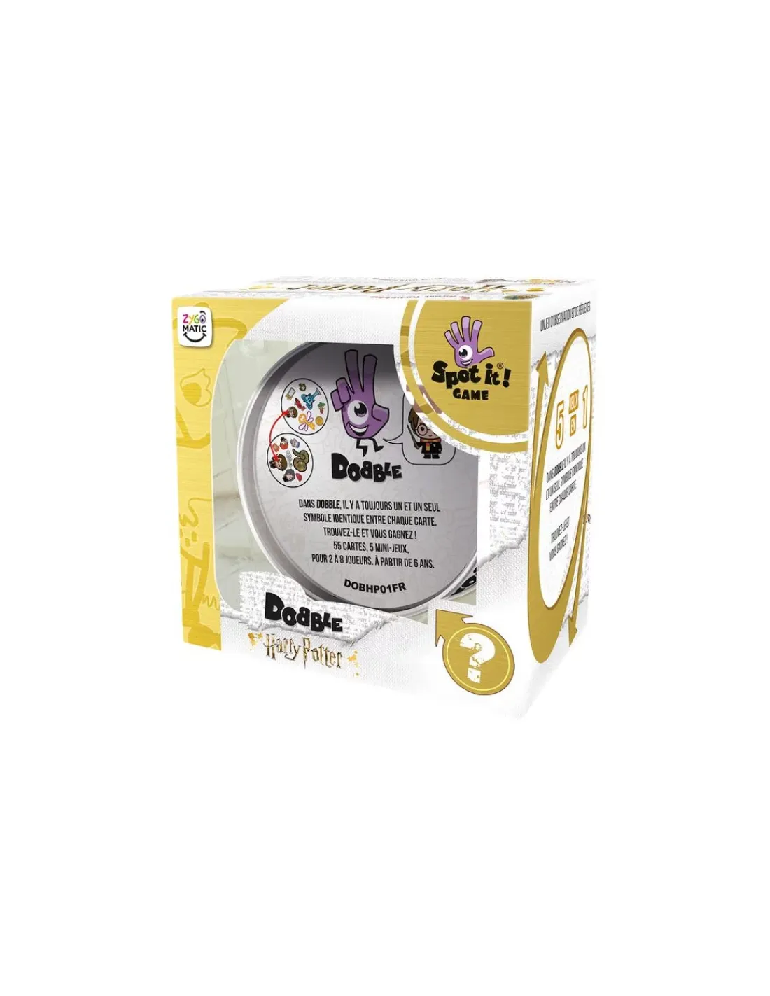 Deux légendes se retrouvent dans cette petite boîte : Dobble, ses 55 cartes, ses 5 règles et son principe qui fédère toute la famille et les amis autour d’un moment convivial, et Harry Potter, la saga célèbre dans le monde entier. Les symboles de ce Dobble en sont tirés, de « celui dont on ne peut prononcer le nom » à Hermione Granger, en passant par la Basilisk ou, évidemment, Harry lui-même.
