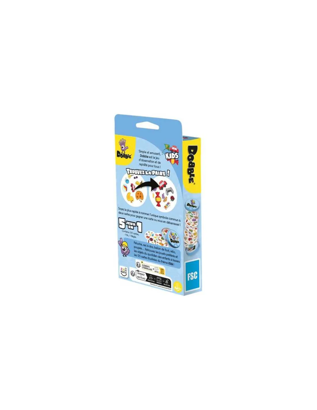 Repérez vite l’unique symbole en commun entre les cartes et, selon la règle du jeu en cours, remportez la partie ! Grâce à des règles claires, assimilées en l’espace d’une minute, Dobble, c’est l’assurance d’une ambiance folle autour de la table !