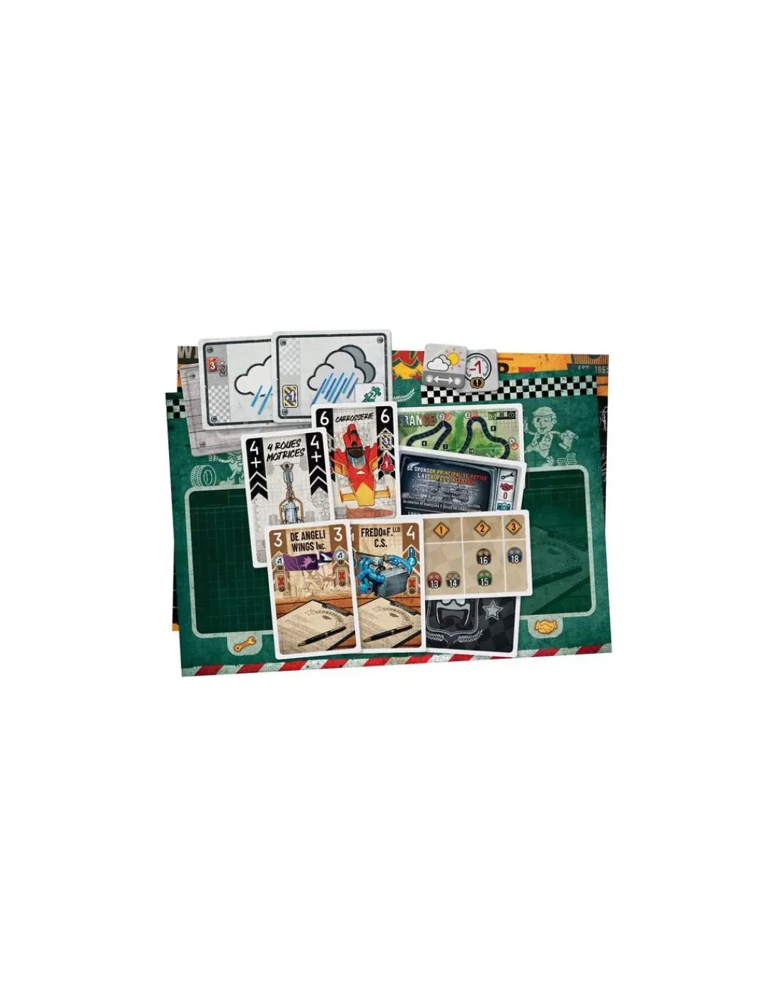 Ce jeu contient 2 plateaux grand format recto/verso (4 circuits), 4 cartes Circuit, 6 bolides et 6 leviers de vitesse, 6 tableaux de bord ,72 cartes vitesse, 48 cartes Heat & 37 cartes Stress, 114 cartes Amélioration, 35 carte Sponsor, 10 cartes Légendes, 10 cartes Évènement, 1 Fiche Légendes & 1 Fiche Championnat, 6 jetons Météo & 12 jetons État de la piste, 2 Silhouettes Presse, 1 carnet de fiches de score et 2 livrets de règles.