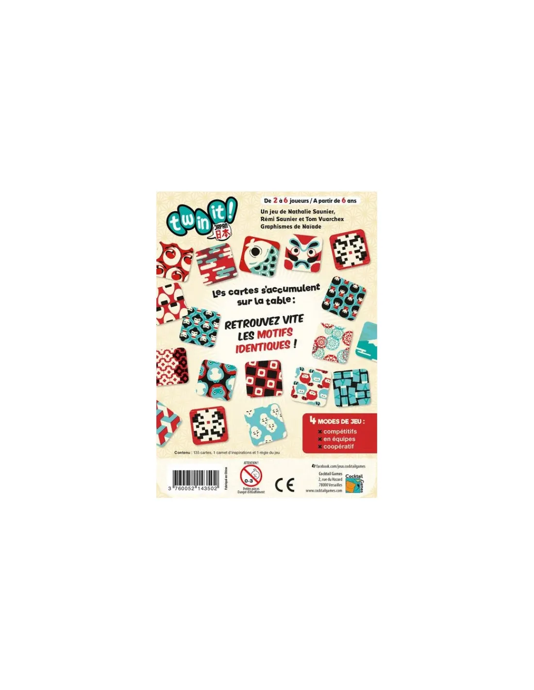 Découvrez le jeu twin it Japan de Cocktail game, un jeu d’observation et de rapidité pour jouer entre amis ou en famille avec 4 modes de jeu complémentaires (compétitifs, en équipes et coopératif), cette version du jeu de cartes Twin it est une édition dédiée à la culture japonaise. Elle contient un carnet d’inspirations des superbes illustrations de Naïade.