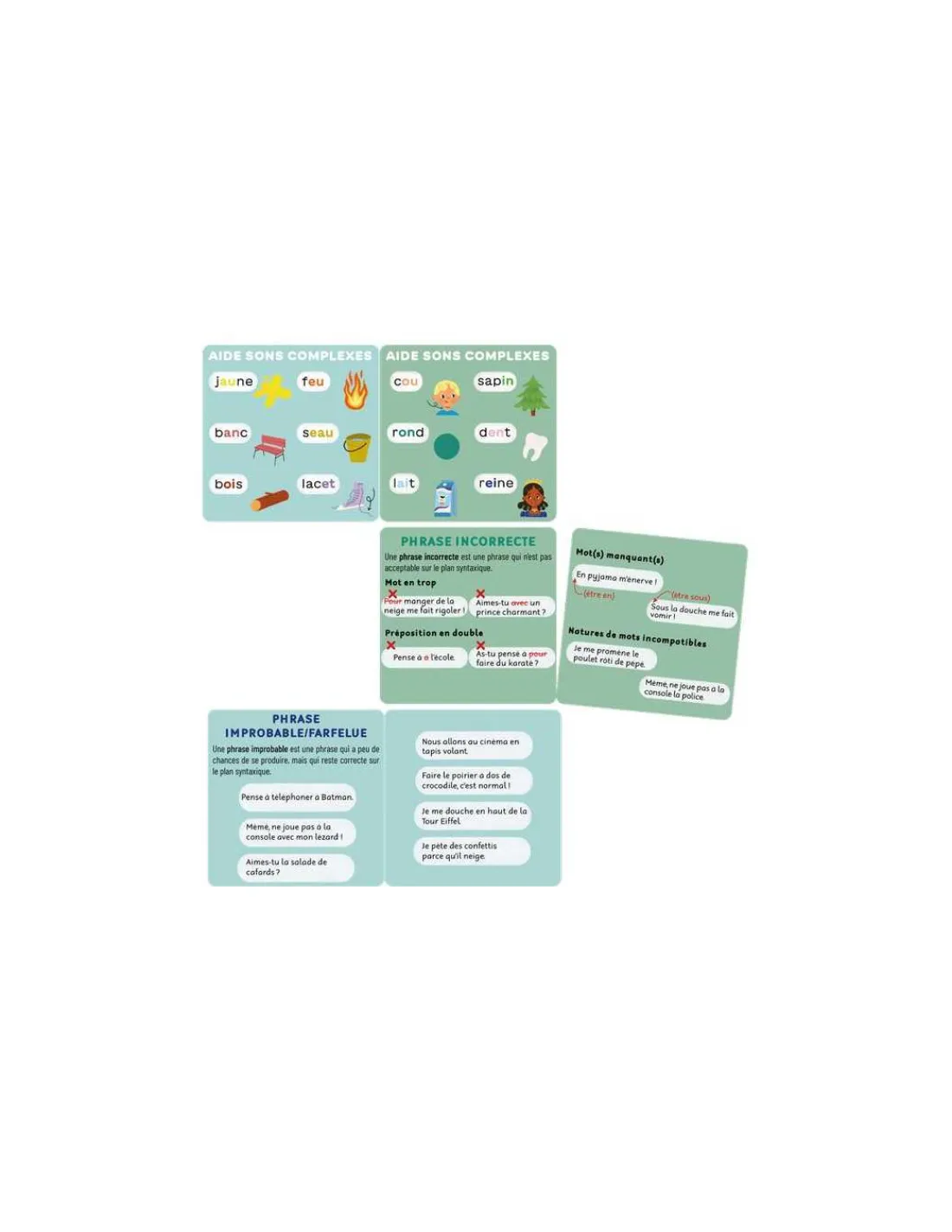 La boite de jeu comprend 100 cartes phrases recto/verso, 8 cartes « Aide » facilitant la lecture des sons difficiles pour jouer au autonomie sans adulte et 3 cartes « Règles du jeu ».