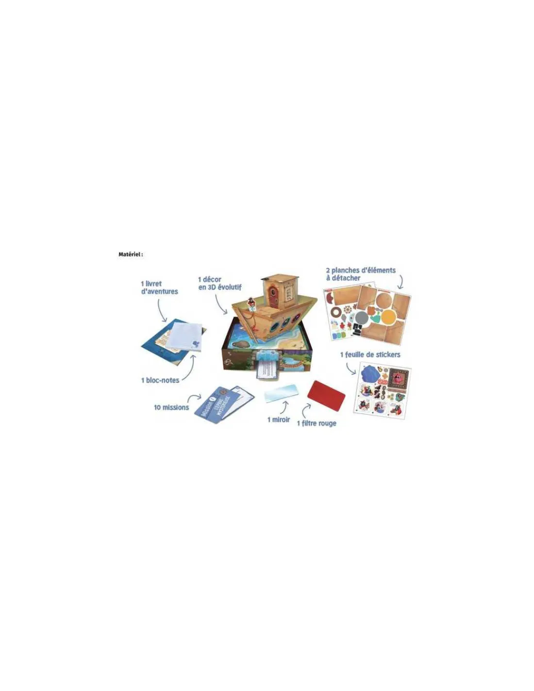 La boite de jeu contient 1 décor en 3D évolutif à monter, 10 missions, 1 filtre rouge, 1 miroir, 1 bloc notes, 1 livret d’aventures, 1 feuilles de stickers, des éléments en carton 1 règle du jeu.