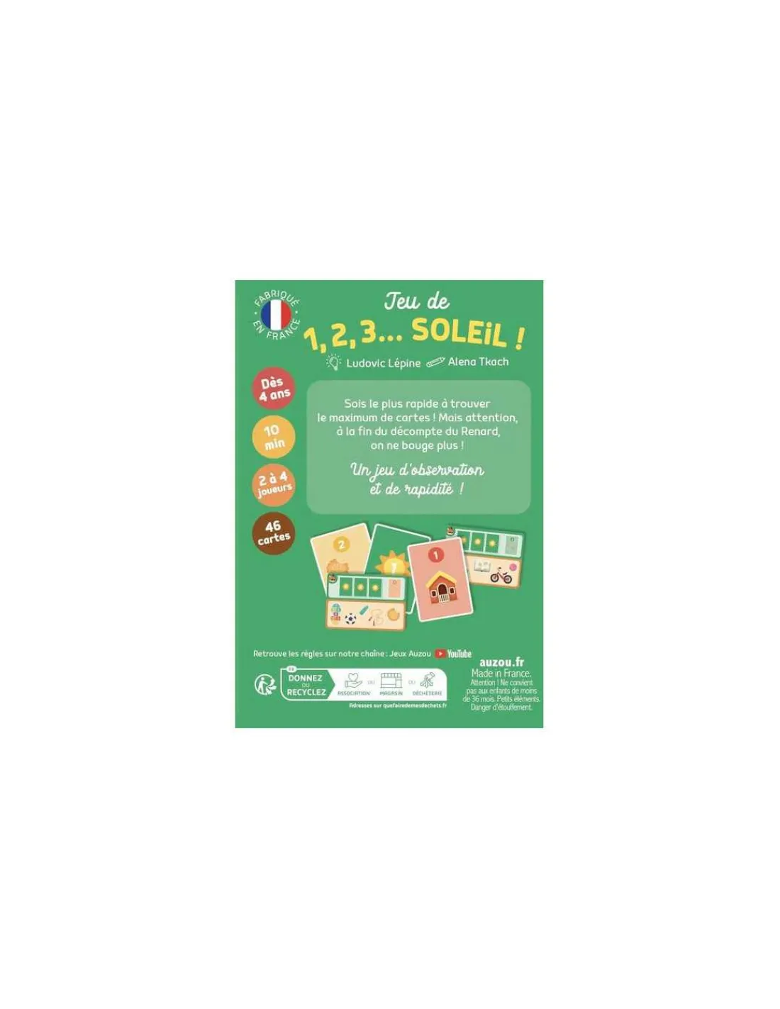 Découvrez le jeu de cartes 1,2,3 soleil! de Auzou, un jeu de rapidité et d’observation à partir de 4 ans. Sois le plus rapide à trouver le maximum de cartes ! Mais attention, à la fin du décompte du Renard, on ne bouge plus!