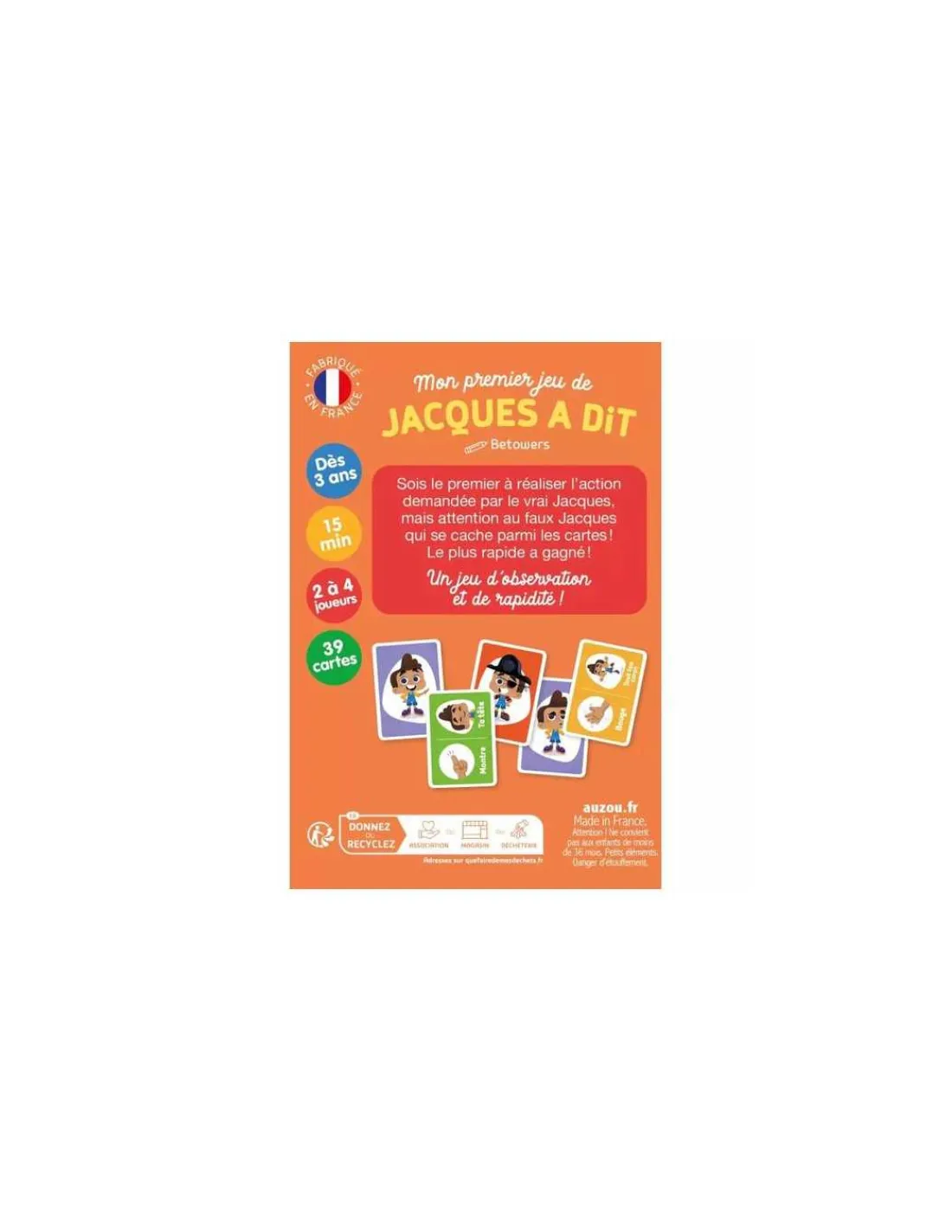 Découvrez le jeu Mon premier jeu de Jacques a dit de Auzou, un jeu de cartes de rapidité et d’observation pour jouer de 2 à 4 joueurs à partir de 3 ans. Le célèbre jeu de cour de récré enfin adapté en jeux de cartes!