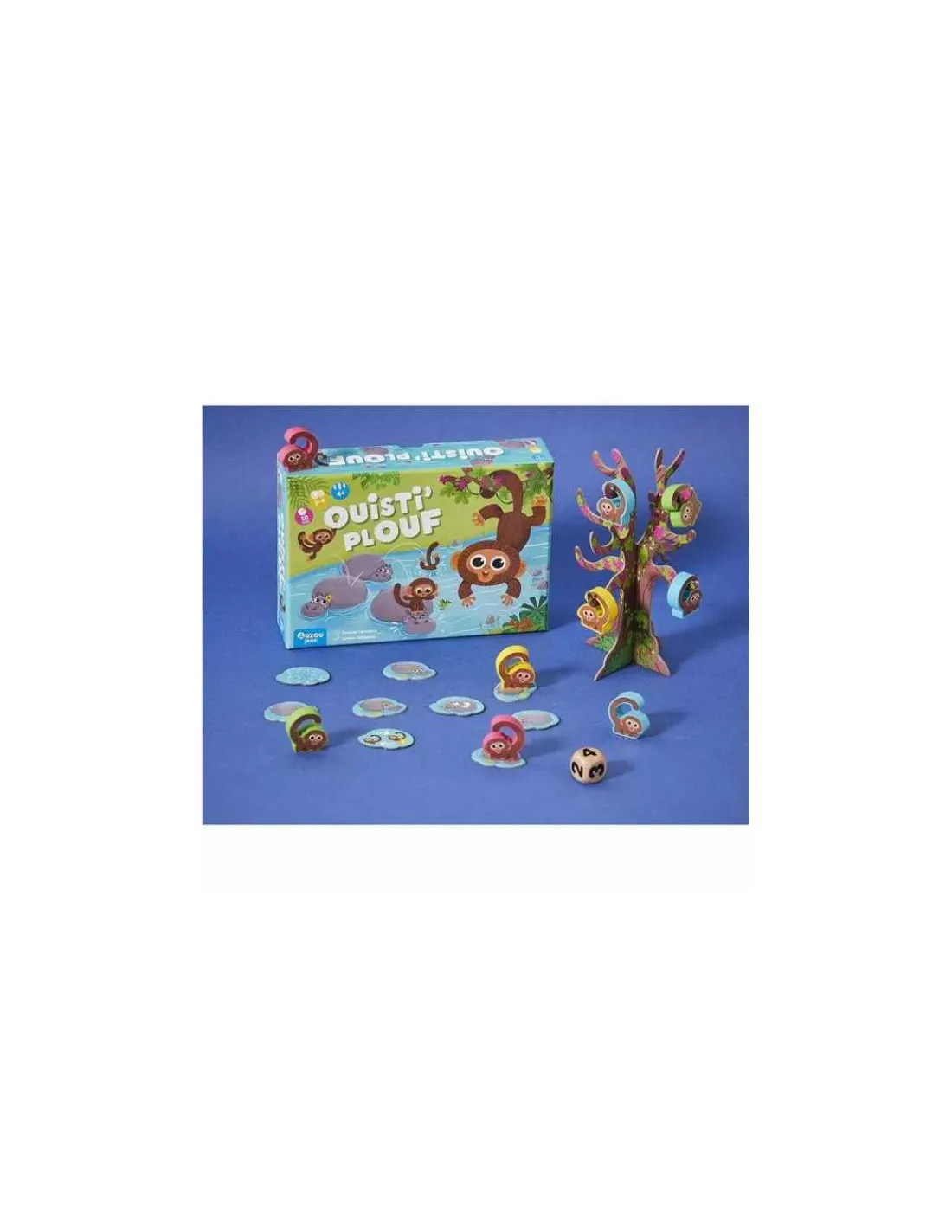 La boite de jeu contient 39 tuiles Hippo, 1 rive de départ, 12 pions Ouisti’ en bois, 1 arbre en 3D, 1 dé en bois et les règles du jeu.