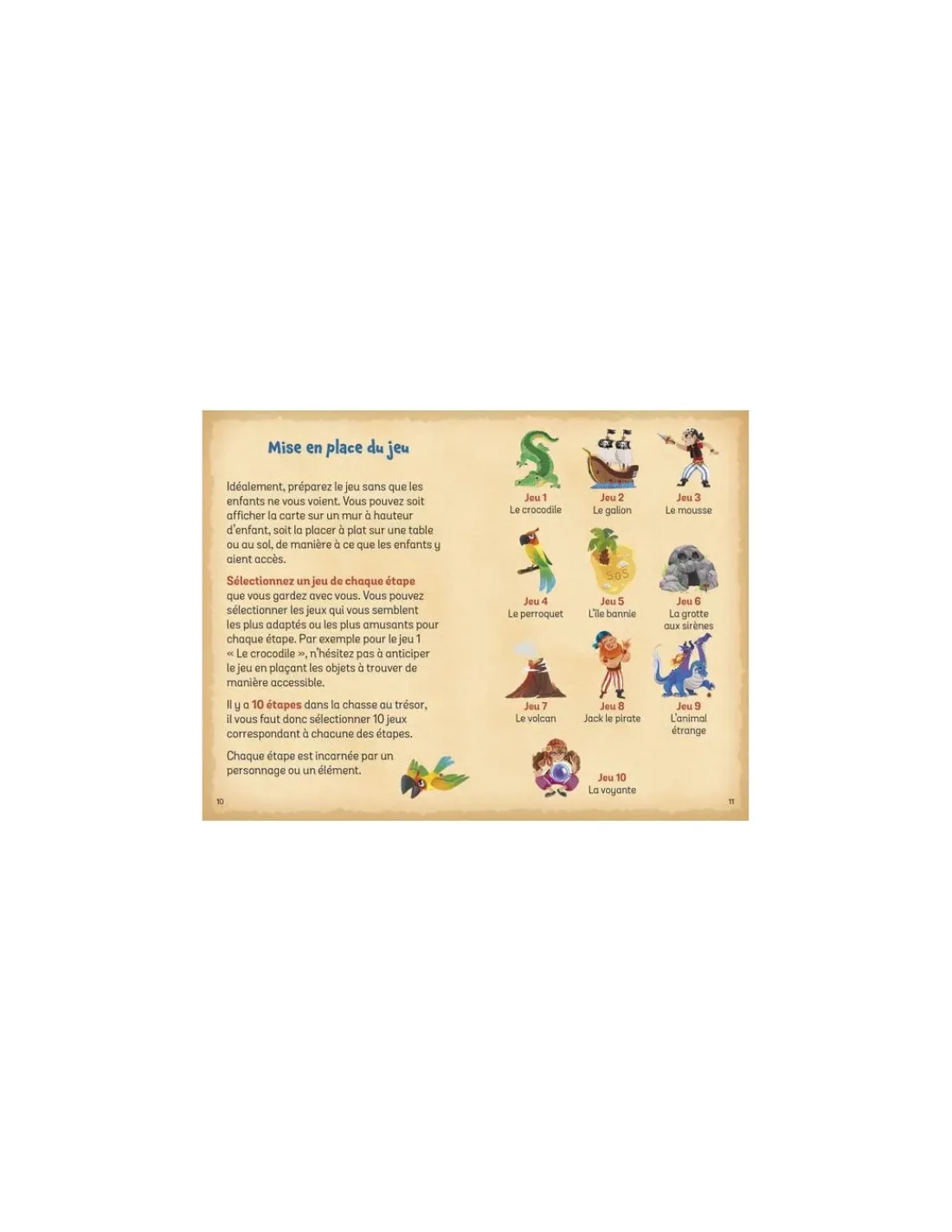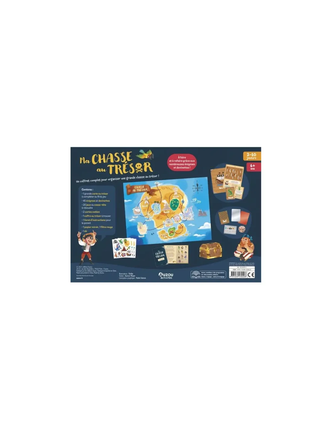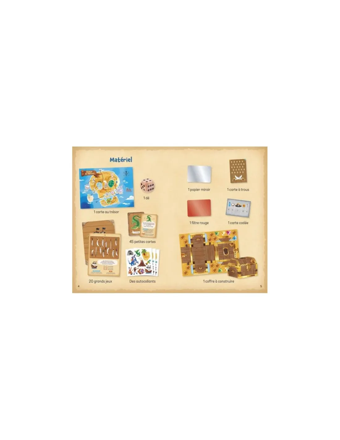 Le jeu contient une grande carte au trésor à compléter au fil du jeu, 45 énigmes et devinettes, 20 jeux ou casse-tête à résoudre, 2 cartes codées, un coffre au trésor à trouver, un livret d’instructions pour les parents, 1 papier miroir, 1 filtre rouge et un dé.