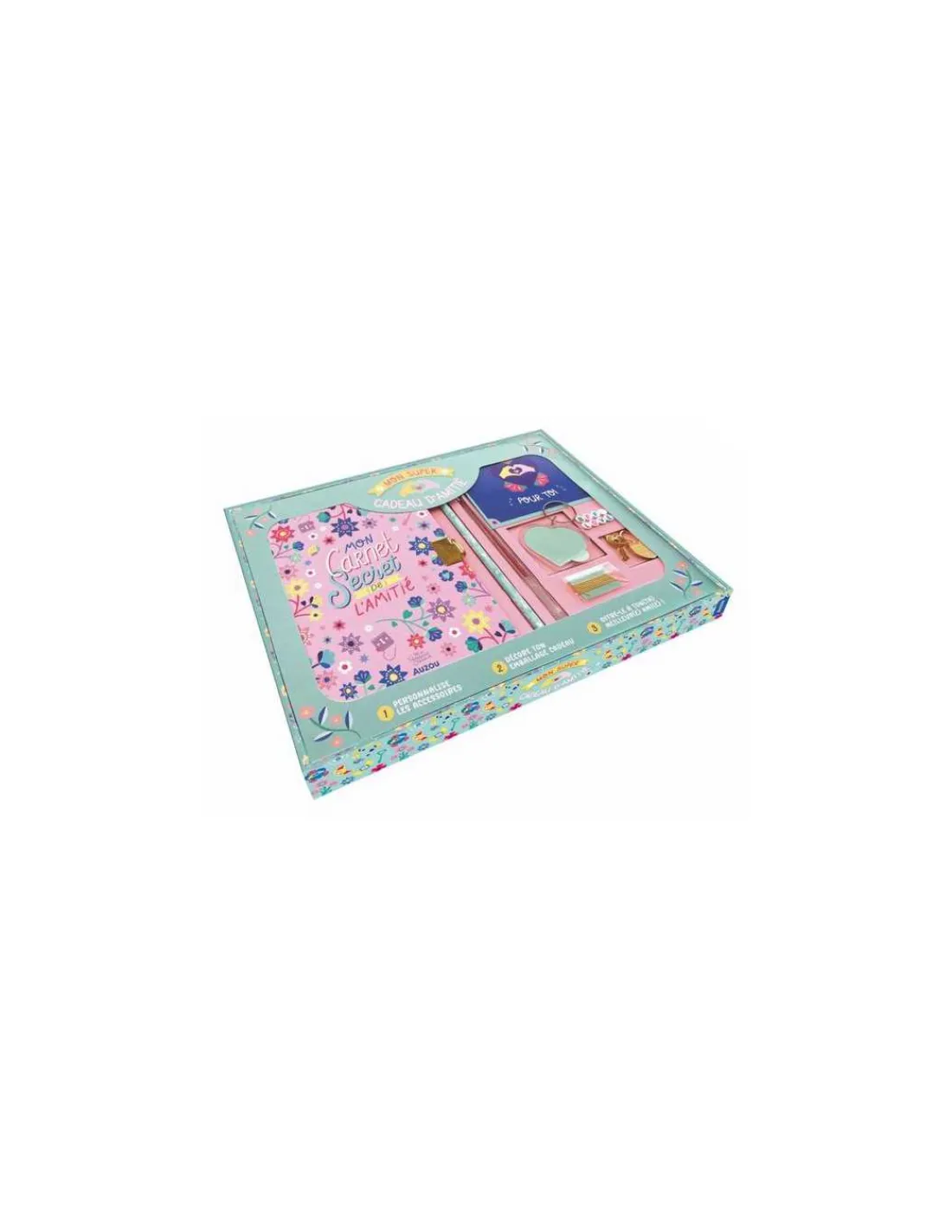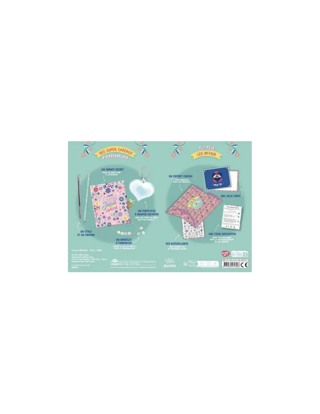 Le coffret comprend un carnet secret, un stylo et un crayon, un bracelet à fabriquer, un porte clé à monter, un coffret cadeau, une jolie carte, des autocollants et une fiche explicative.