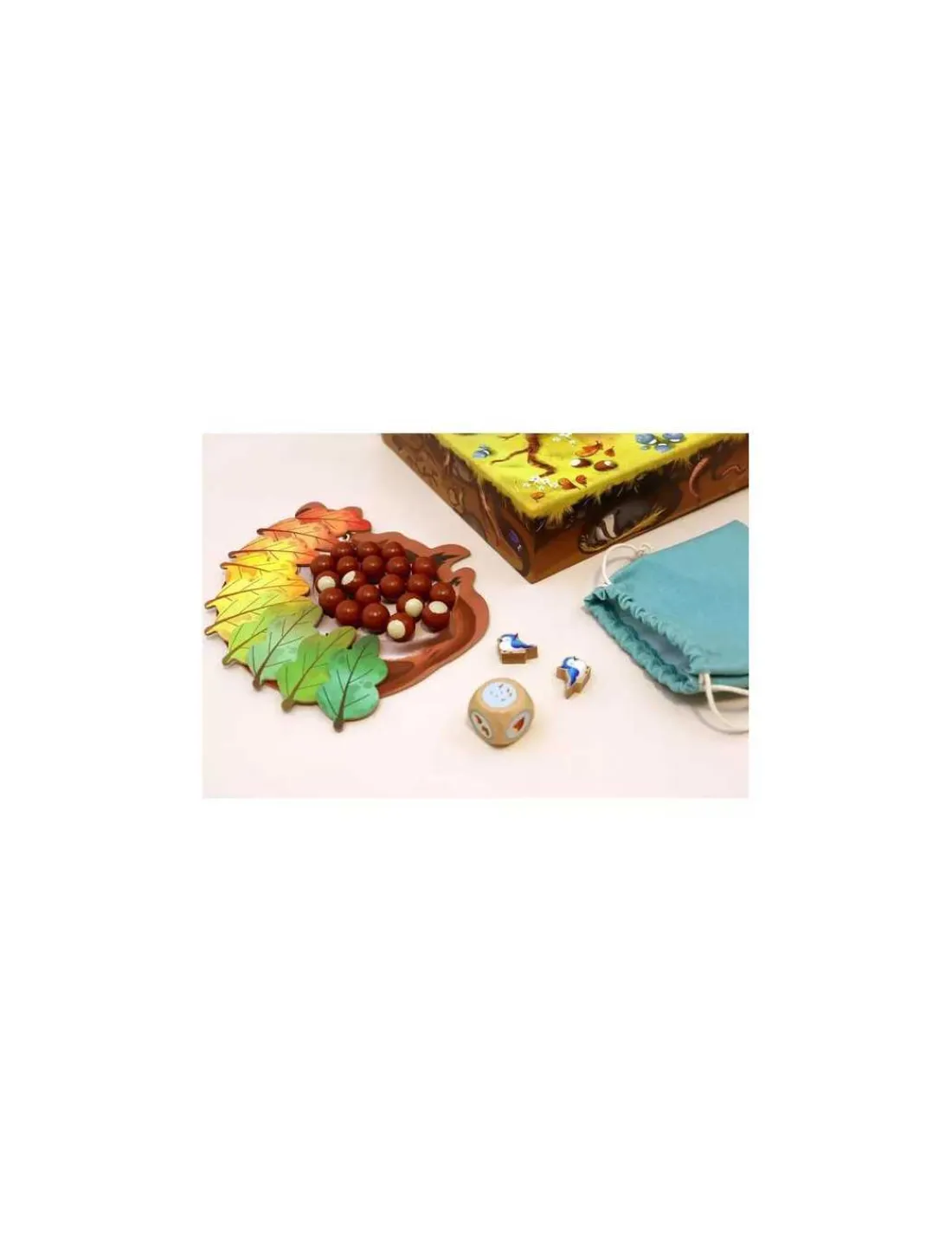 La boite de jeu contient 1 arbre en 3D à monter, 1 belette, 10 feuilles, 20 noisettes en bois, 4 oiseaux en bois, 1 dé en bois et 1 sac en tissu.