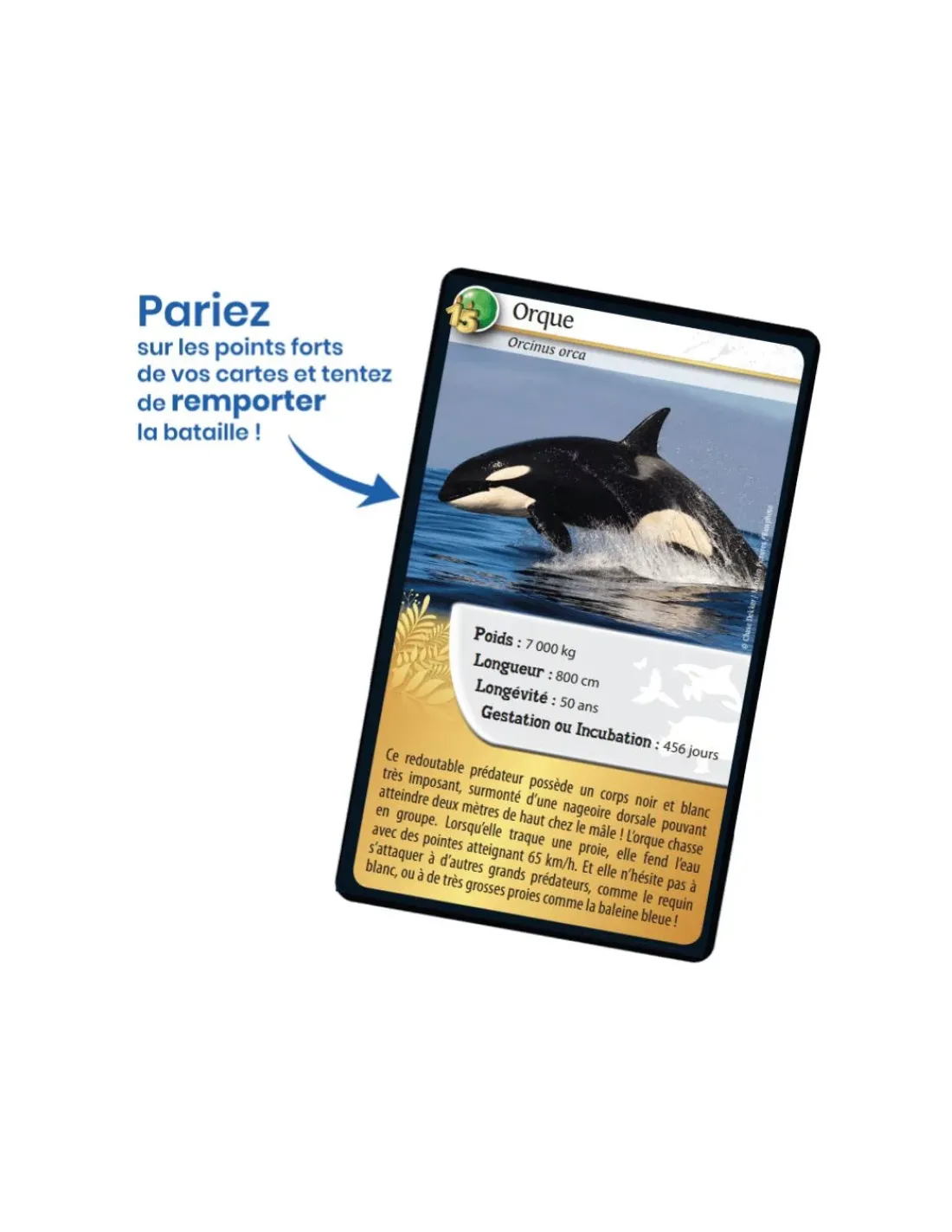 Découvrez les espèces à préserver, puis pariez sur leurs points forts pour collecter toutes les cartes du jeu et remporter la partie. Saurez-vous identifier la caractéristique qui vous semble la plus forte pour gagner la manche et remporter les cartes des autres joueurs? Le premier joueur qui collecte toutes les cartes du jeu remporte la partie!