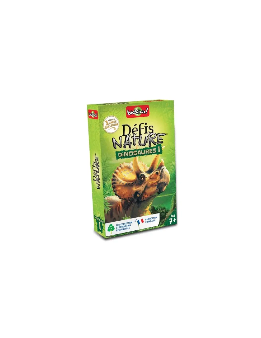 Découvrez le jeu Défis nature dinosaures vert de Bioviva, un jeu de carte éducatif qui vous emmène à la rencontre des dinosaures.