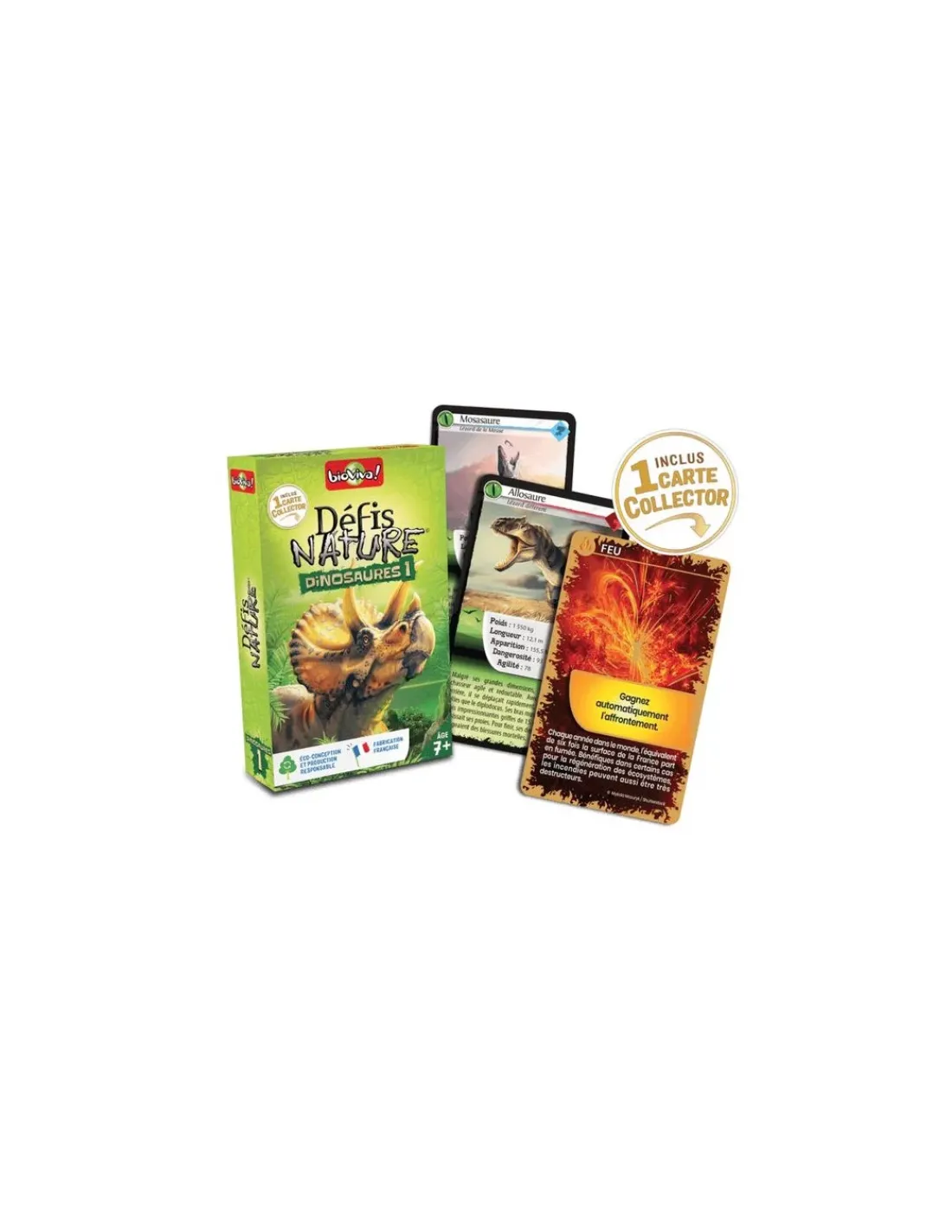 Avec Défis Nature Dinosaures, les joueurs parient sur les points forts de leurs dinosaures (poids, taille, dangerosité…). Le dinosaure le plus fort permet de remporter la carte des autres joueurs. Mais attention aux espèces ayant vécu le moins longtemps sur Terre… elles permettent de retourner la situation à tout moment!