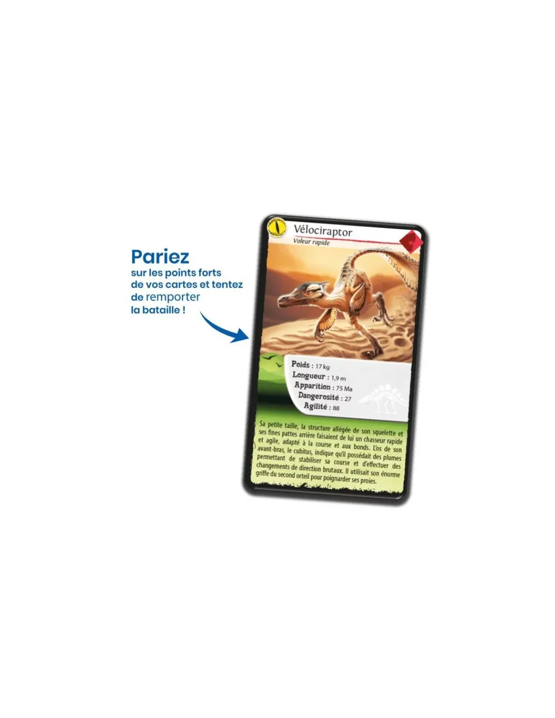 Chaque carte du jeu est illustrée d’un dinosaure, de ses caractéristiques (poids, longueur, apparition en millions d’années écoulées, indice de dangerosité, indice d’agilité) et contient du contenu éducatif pour en savoir plus sur l’espèce. Une carte Collector aléatoire est incluse dans le jeu et permet aux joueurs de découvrir un phénomène naturel (ex : Feu, Arc-en-ciel, Tornade, Éclipse, Grêle, Aurore Polaire…) et entraîne une action spécifique sur la manche.