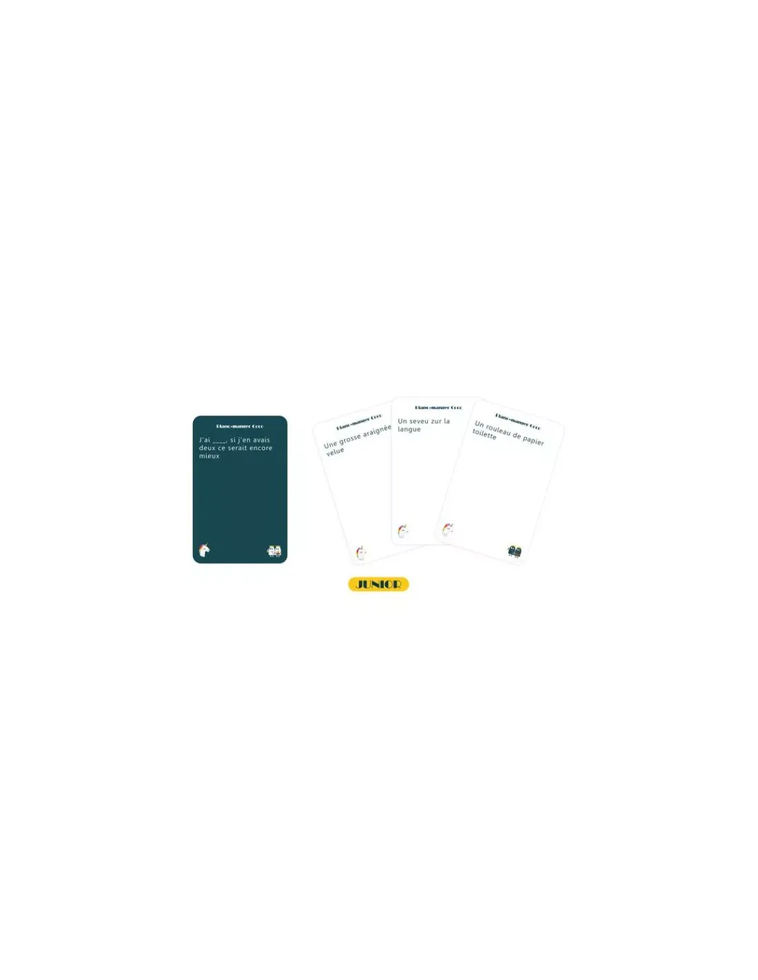 Le jeu contient 100 cartes « questions », 400 cartes « réponses » et la règle du jeu