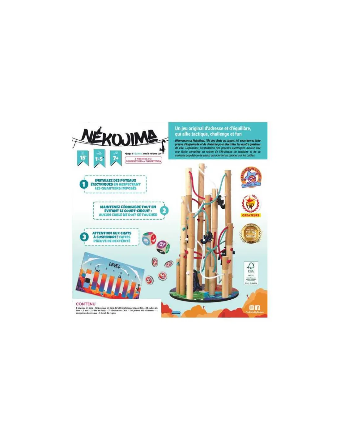 Découvrez le jeu Nekojima de Unfriendly Games, un jeu d’adresse en bois pour jouer de 1 à 5 joueurs, à partir de 7 ans. Un jeu de société amusant et exigeant qui mettra à l’épreuve votre habileté et votre sang froid.