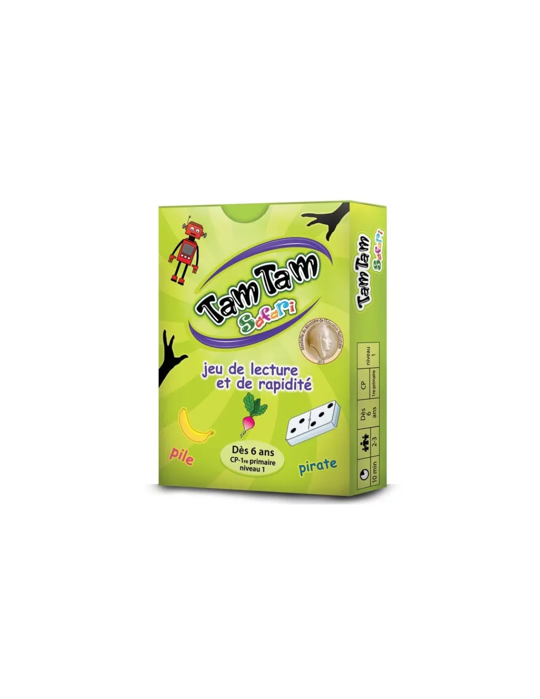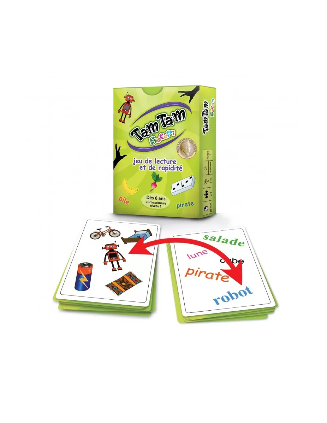 Découvrez le TamTam Safari CP niveau 1, un jeu de carte de lecture et de rapidité pour jongler et jouer avec les mots, un niveau pour le CP niveau 1 pour les enfants à partir de 6 ans. Un jeu où il faudra retrouver les paires avec un dessin et un mot.
